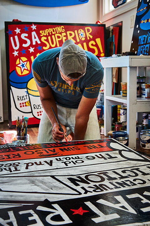 Fine Art Done Boldly is Timʼs artistic mantra, and it materializes in three dramatic genres. His large format, Pop Art-styled paintings provoked through wry humor and vivid images, large biscuit-joined pine wood cutouts of pulp commercial subjects and unique “Cerealism” mosaic—images formed with intricately cut slices of cereal boxes—are astonishing in their complexity and beauty.