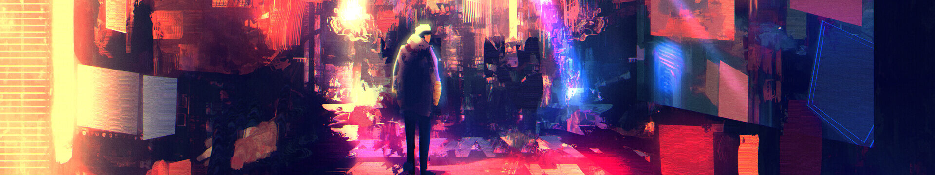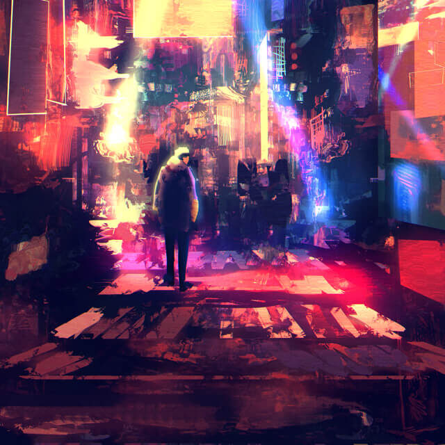 Dark and moody with pops of vibrant purples, reds, and greens this digital abstract artwork mimics city scenes. This abstract wall art evokes somber feelings of solitude and strength.