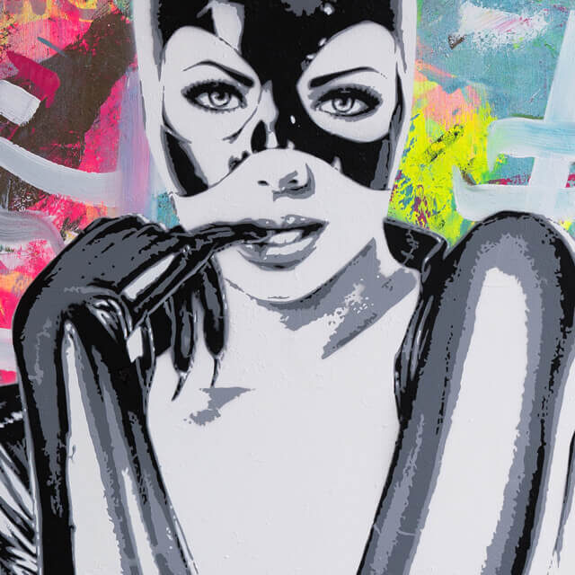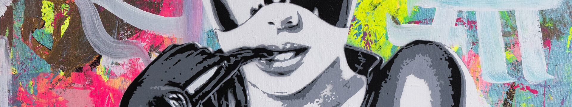 Black and white portraits of pop icons are surrounded by colorful street art and graffiti in this unique pop wall art.