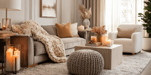 - Textured layers: A chunky knit throw tossed over a sleek sofa, boucle or sherpa accent chairs, and layered rugs that bring depth.