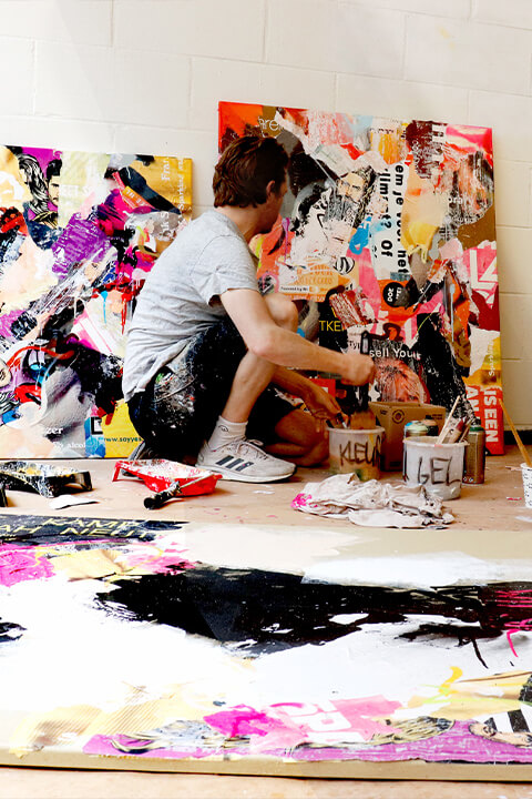 Michiel Folkers is a mixed media artist living and working in Amsterdam. His work is spread all over the world and he exhibits in galleries from Zurich to New York. He is best known for his layered paintings, large canvases in which he combines colorful street posters with spray paint and acrylics.