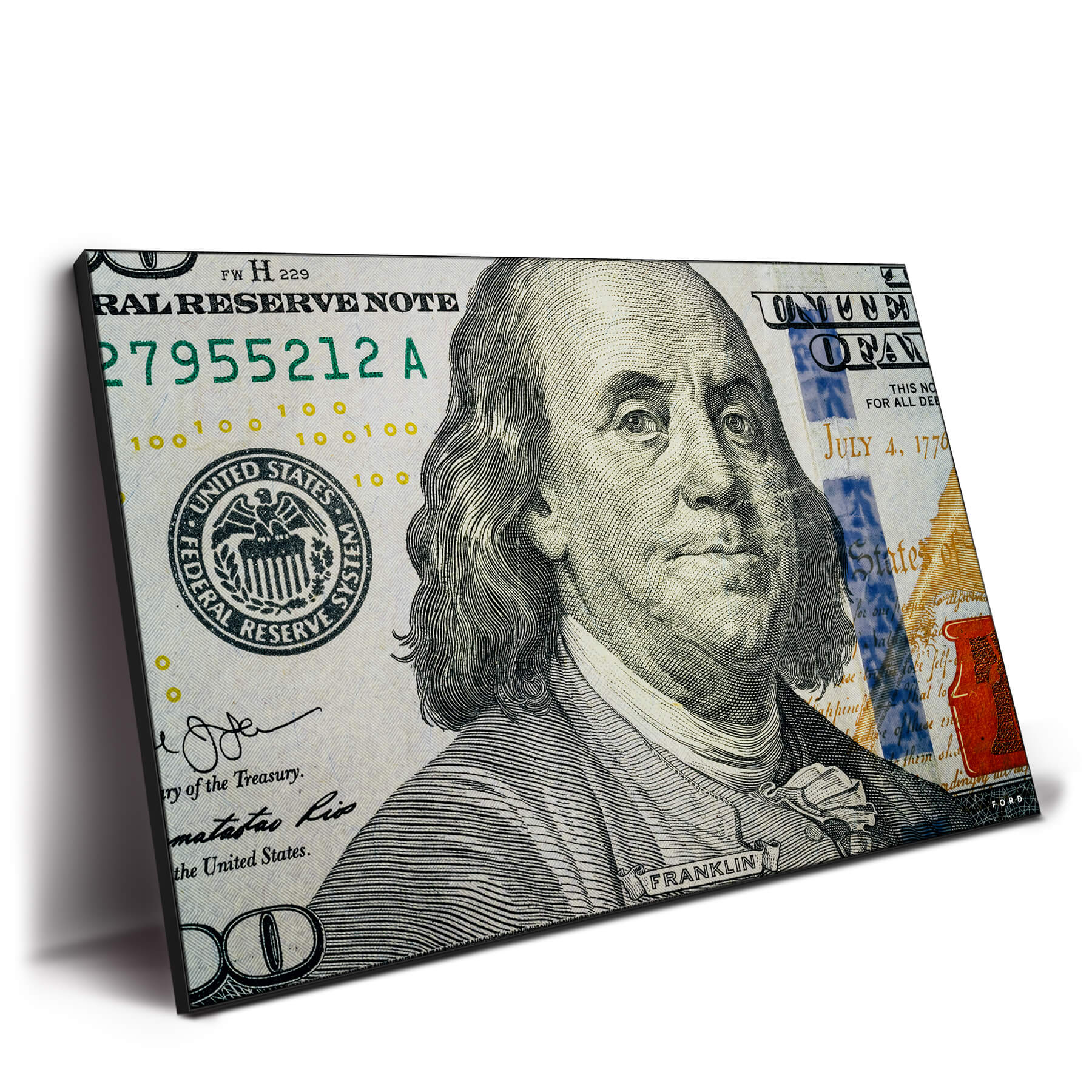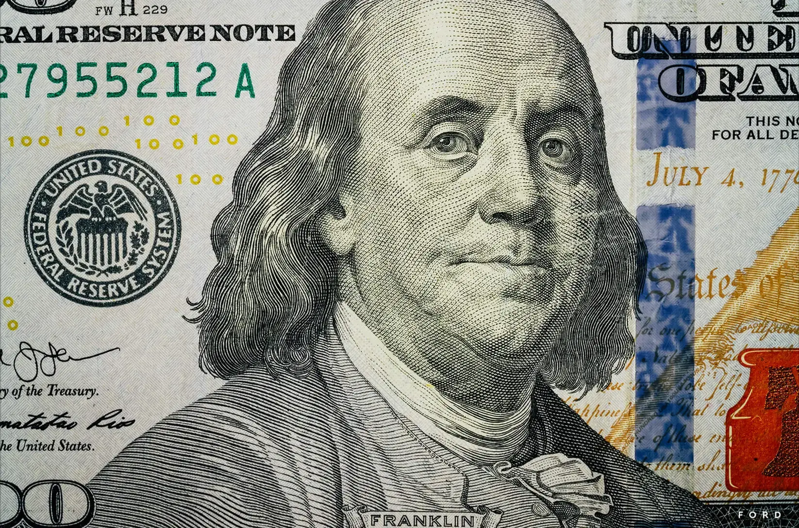 A close-up view captures the detailed portrait of Ben Franklin as featured on the US $100 bill. Franklin’s gaze is direct, with every line and wrinkle of his face sharply defined against the currency’s intricate background. The bill showcases various shades of green, blues, and peach, with distinct security features such as the watermark, security thread, and color-shifting ink prominently visible.