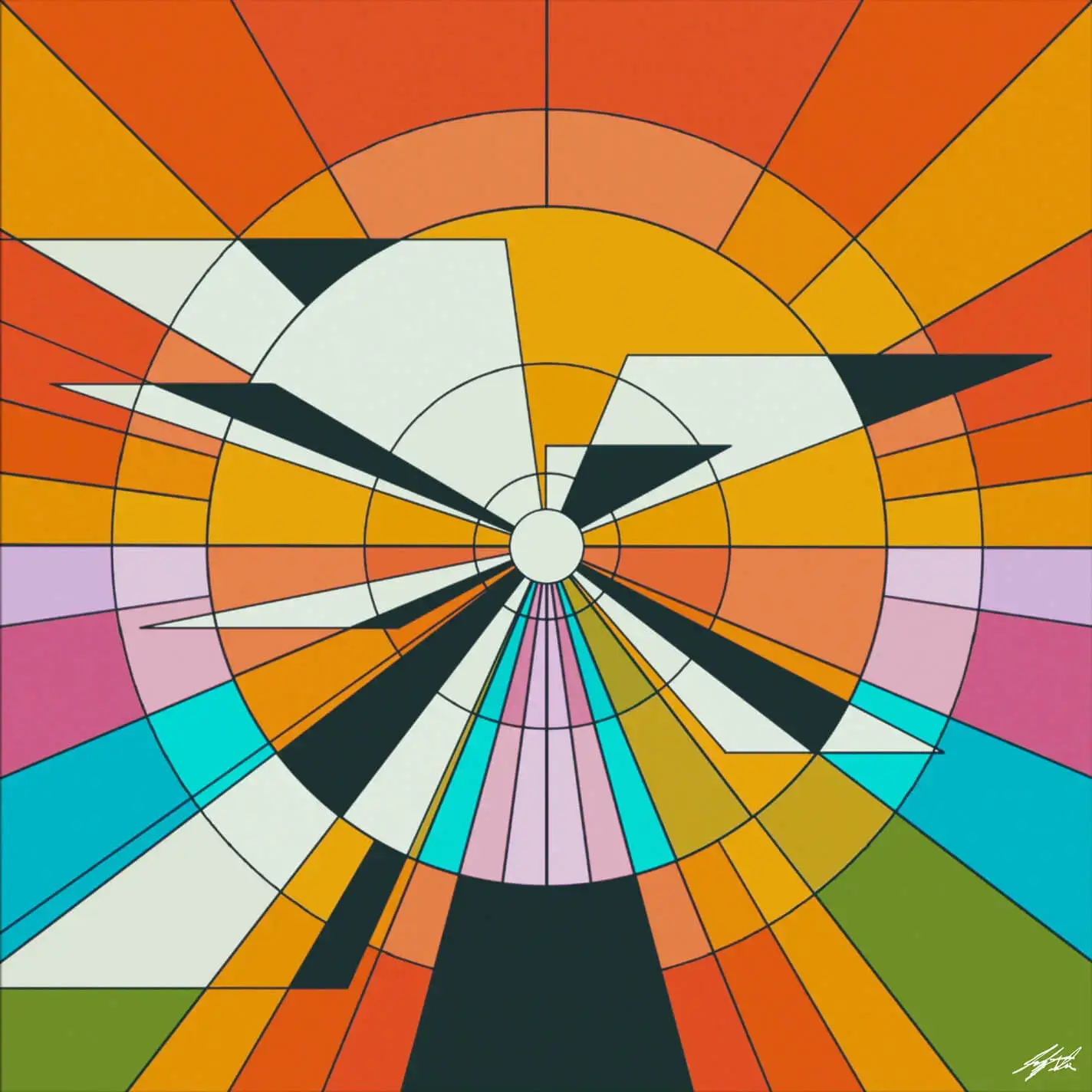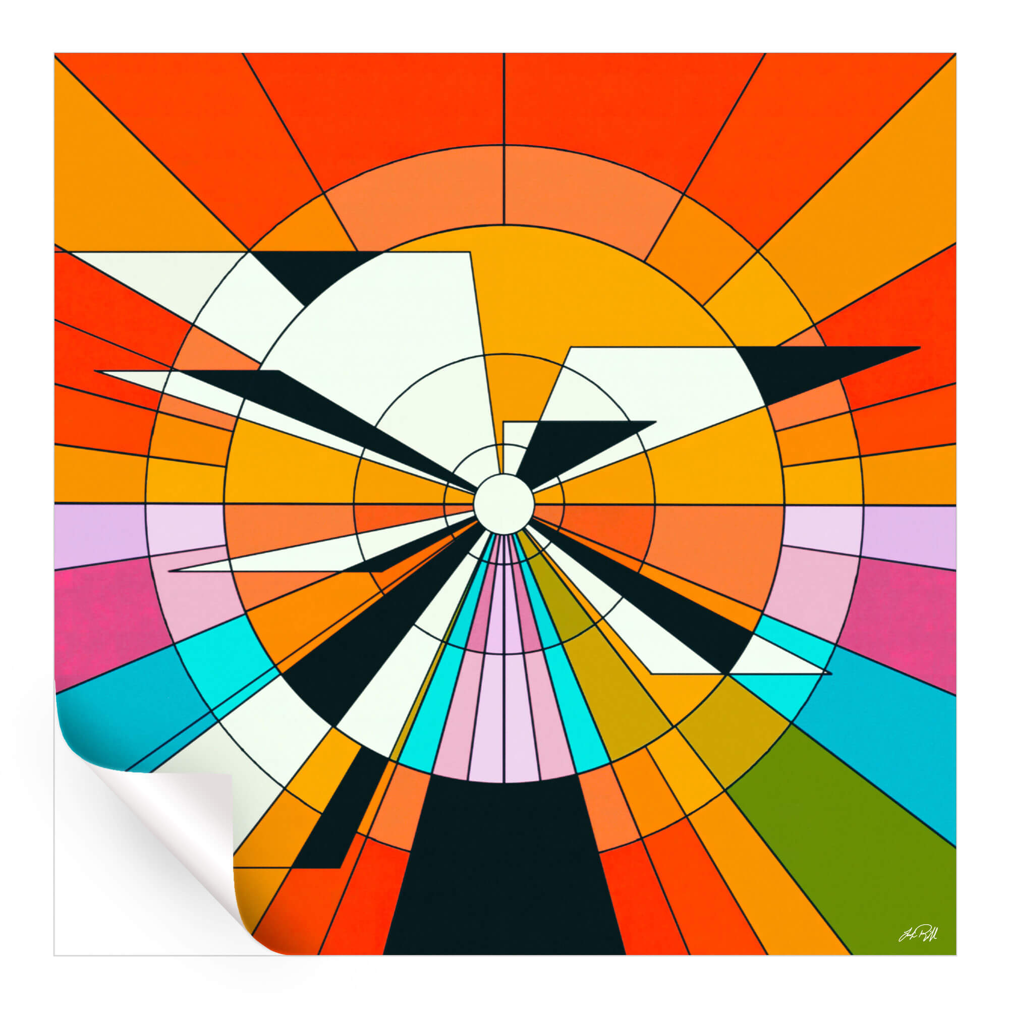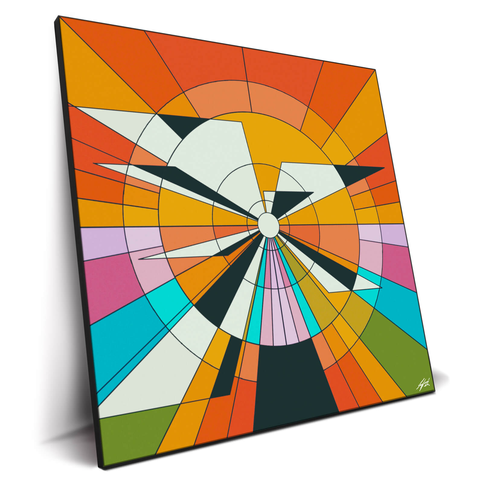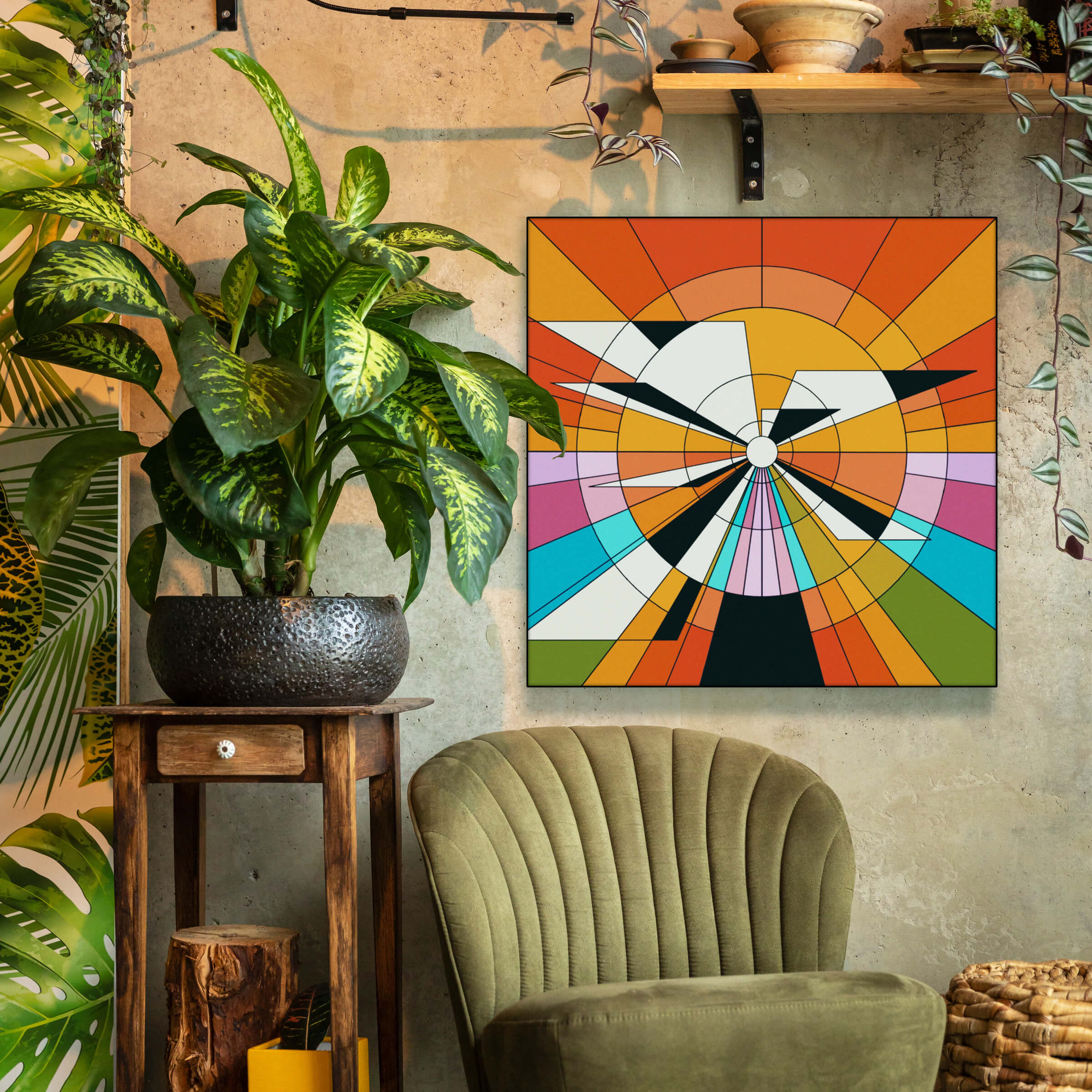 A captivating geometric sunburst radiates from the center of this piece, where vibrant colors segment into rays that stretch outward. The warm oranges and the cool blues and greens contrast sharply, yet harmoniously, guiding the eye in a dynamic interplay of movement.