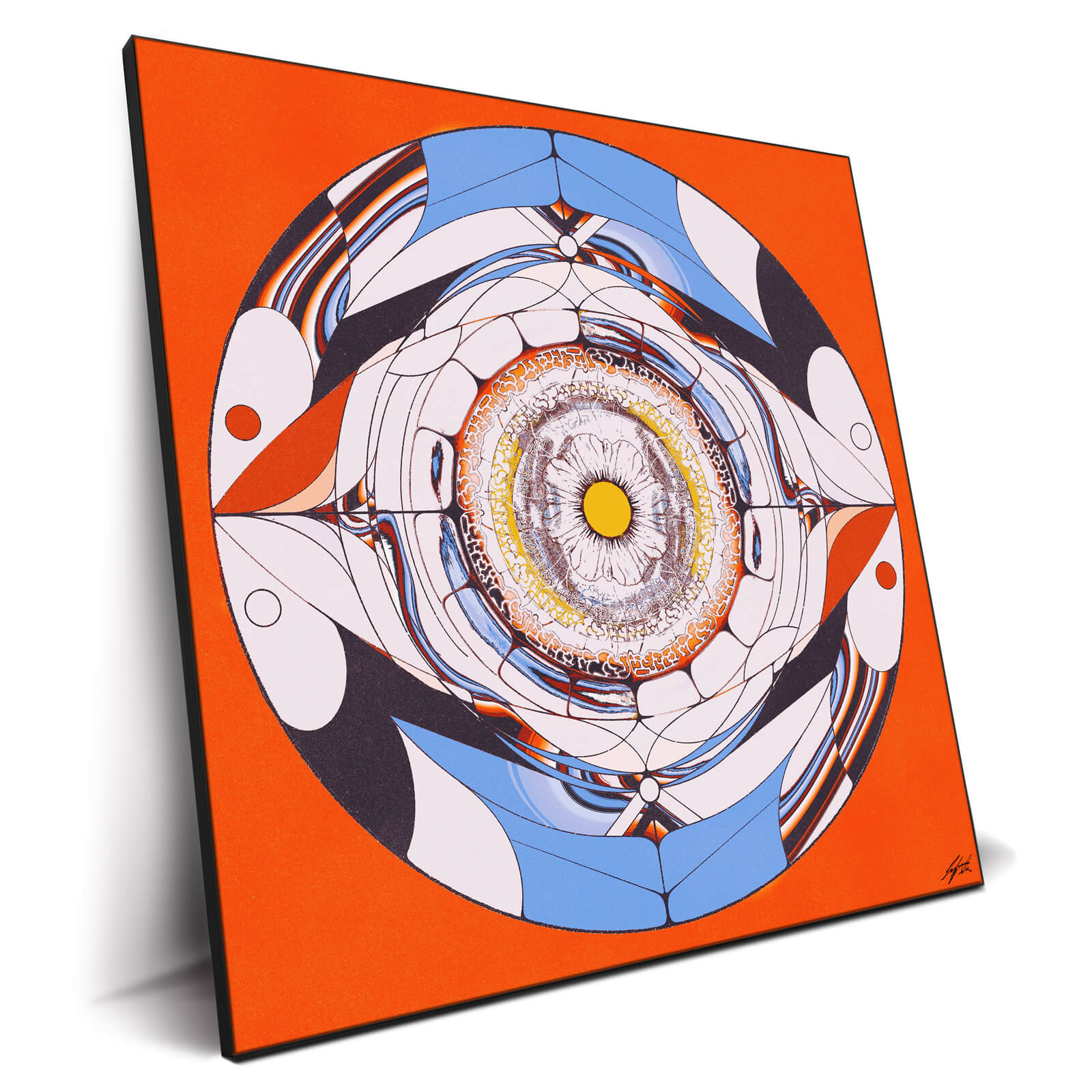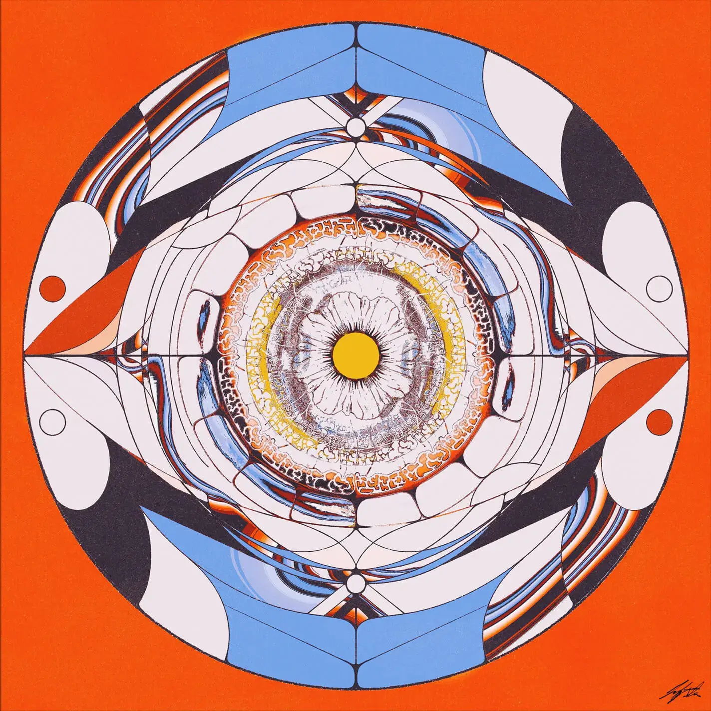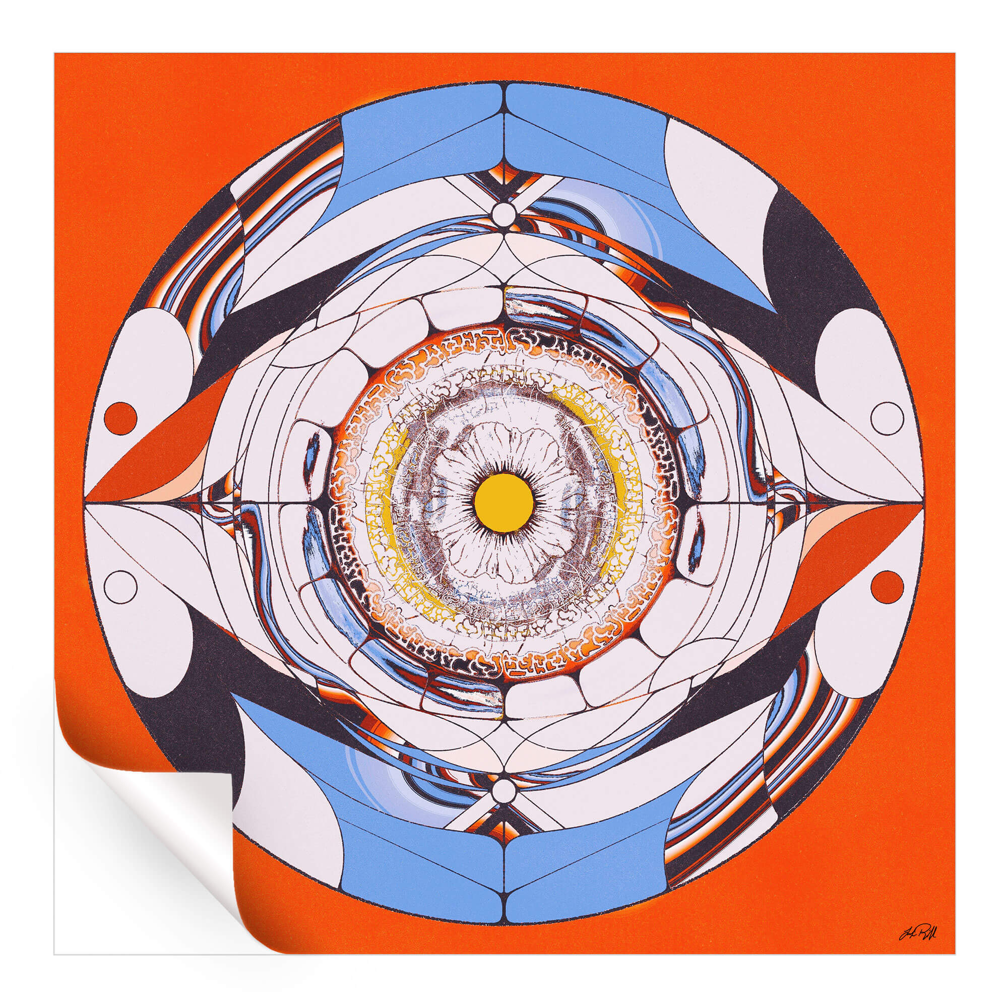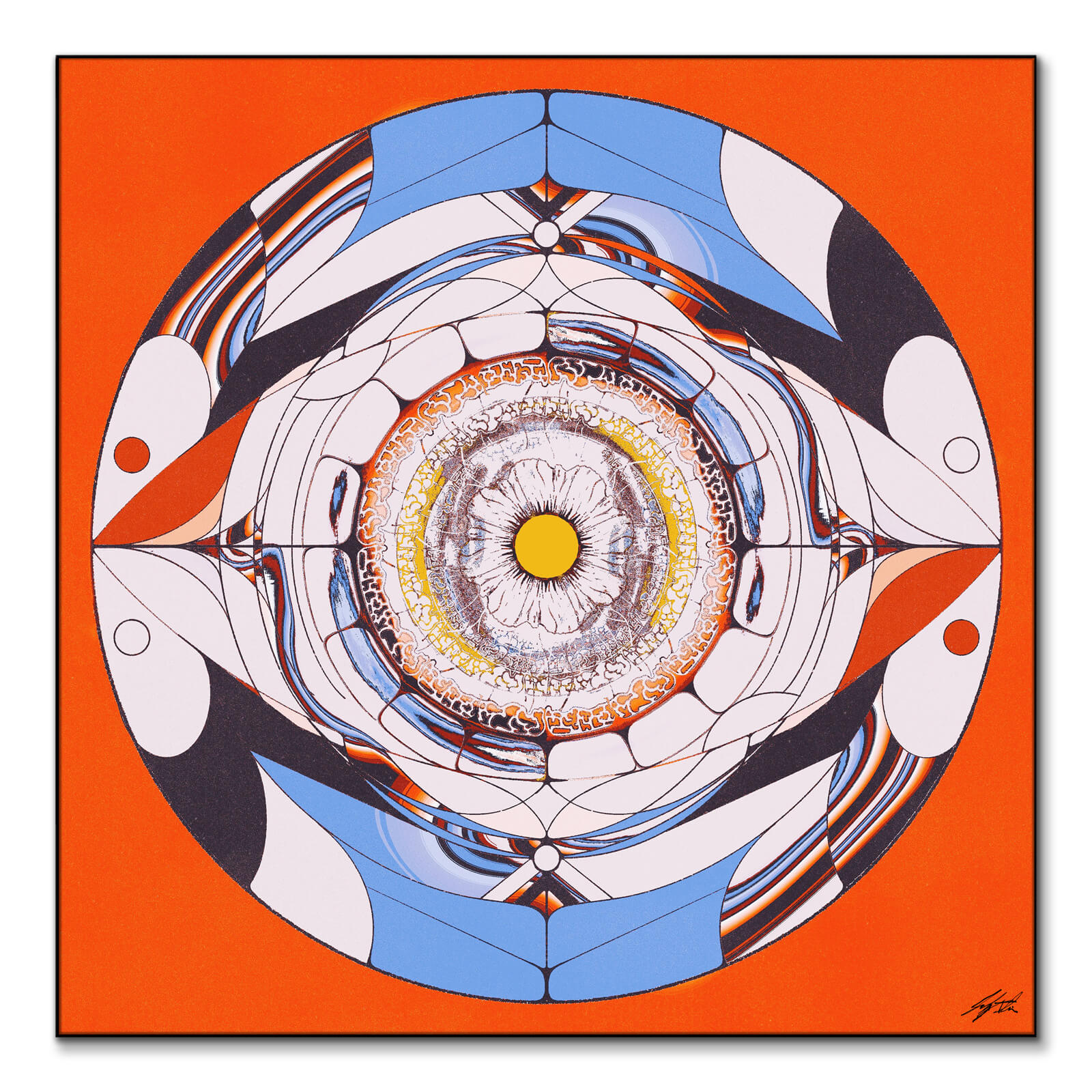 This piece by Jeffrey Thelin showcases a striking circular design with layers of intricate patterns and bold, flowing lines. The use of blue, white, and black against the vibrant orange background creates a dramatic visual impact. Concentric circles draw the viewer’s eye towards the center, where a detailed ring encircles a bright yellow core.
