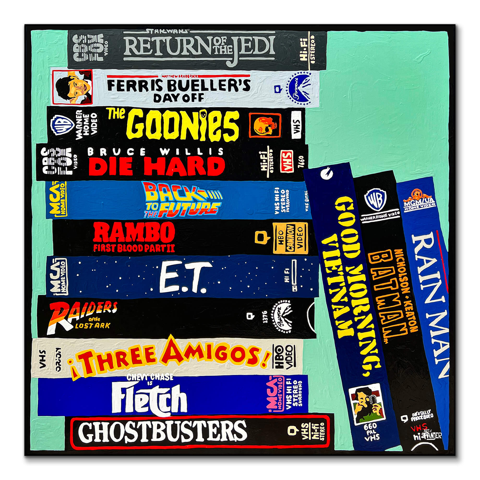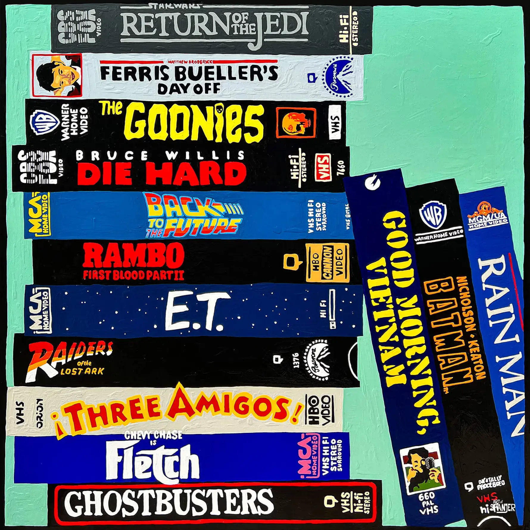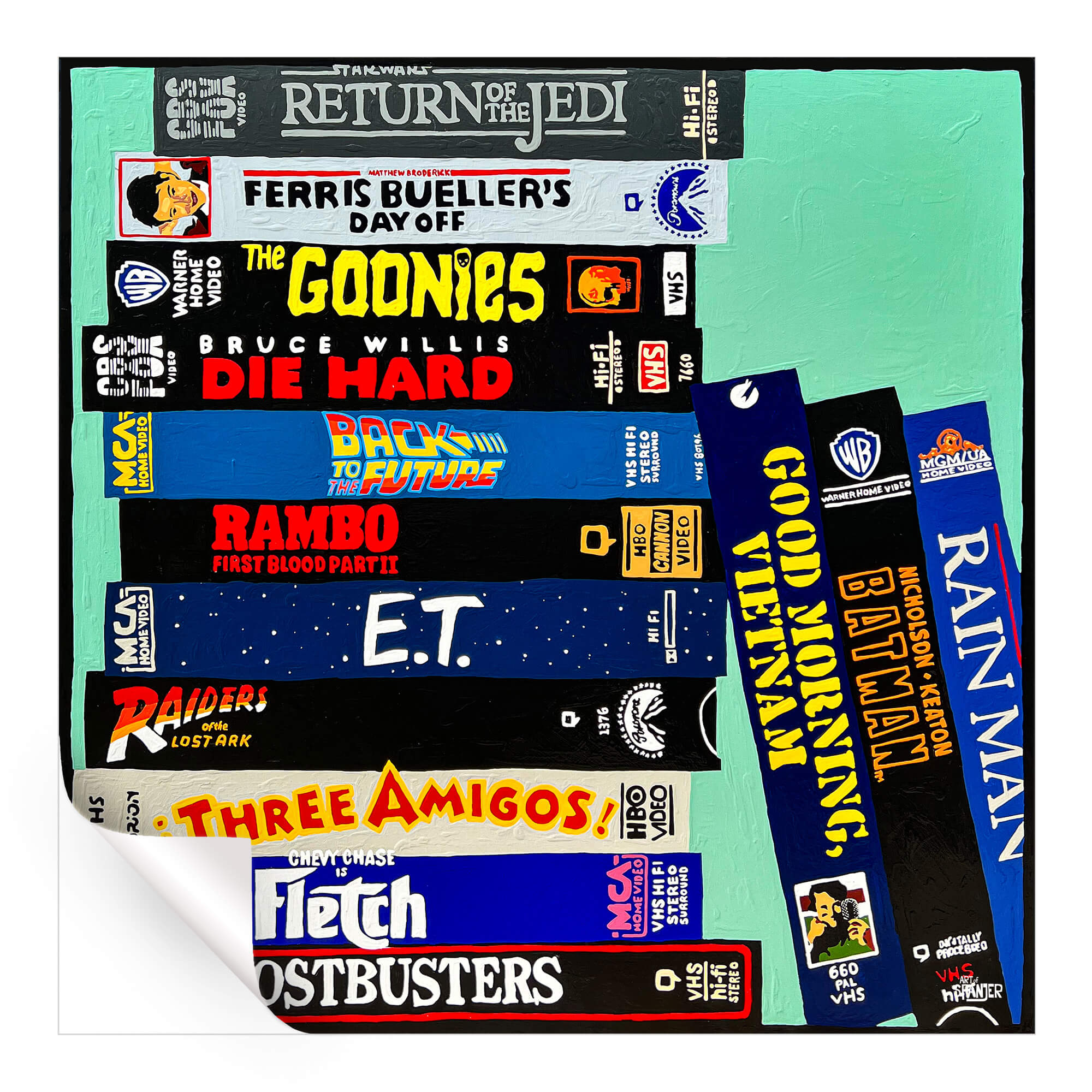 Celebrate the nostalgia of classic cinema with this vibrant artwork featuring iconic VHS movie covers from the ’80s. Titles like “Return of the Jedi,” “Ferris Bueller’s Day Off,” and “E.T.” come to life in bold colors, inviting you to relive those memorable moments. Perfect for any movie lover’s wall, this piece adds a playful and retro touch to your decor.