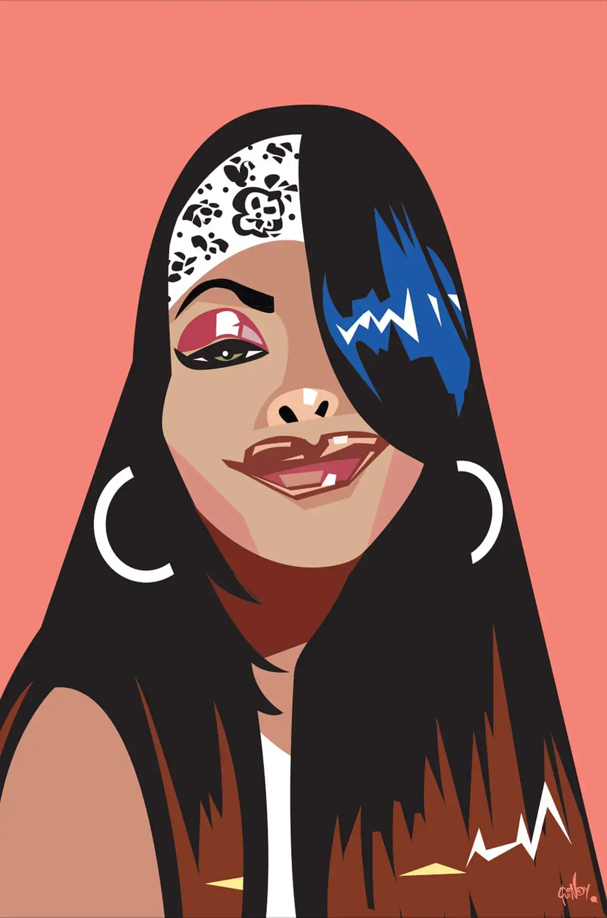 A digital illustration paying homage to the “Princess of R&B” Aaliyah. She is portrayed with long, flowing hair partially covered by a patterned bandana. A striking blue streak contrasts with her dark hair. She wears large hoop earrings, and her makeup is detailed, with prominent eyelashes and glossy lips.