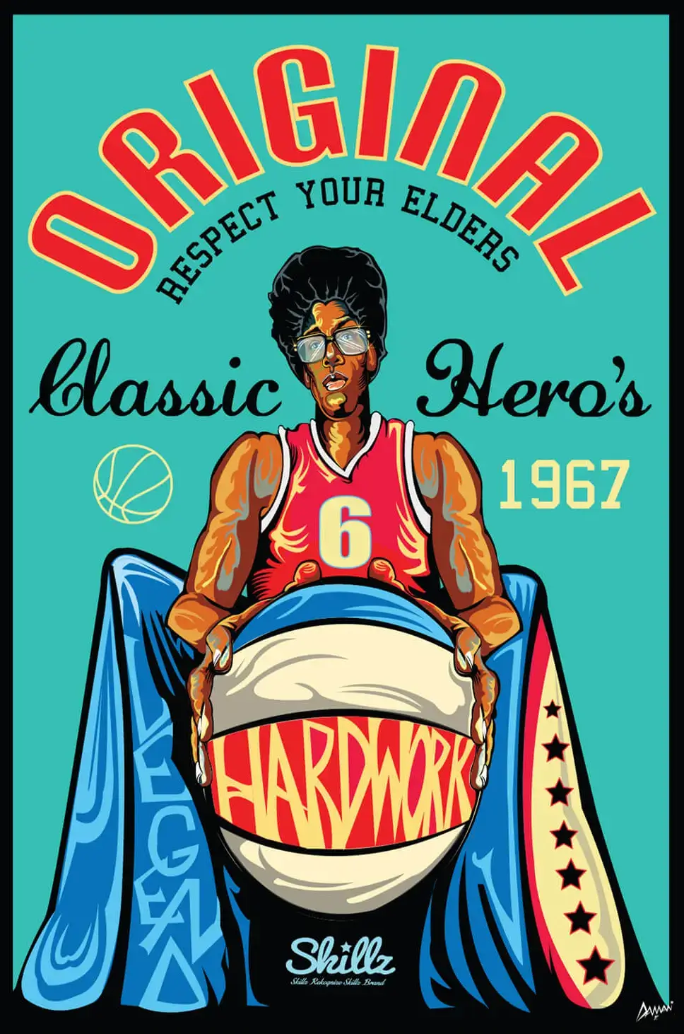 The bold lettering of “ORIGINAL” and “Hardwork” complements the visual, while the backdrop of stars and basketball iconography anchors the piece in its athletic roots. This art piece is a nod to the legends of the court, inspiring nostalgia and respect for the heroes of 1967.