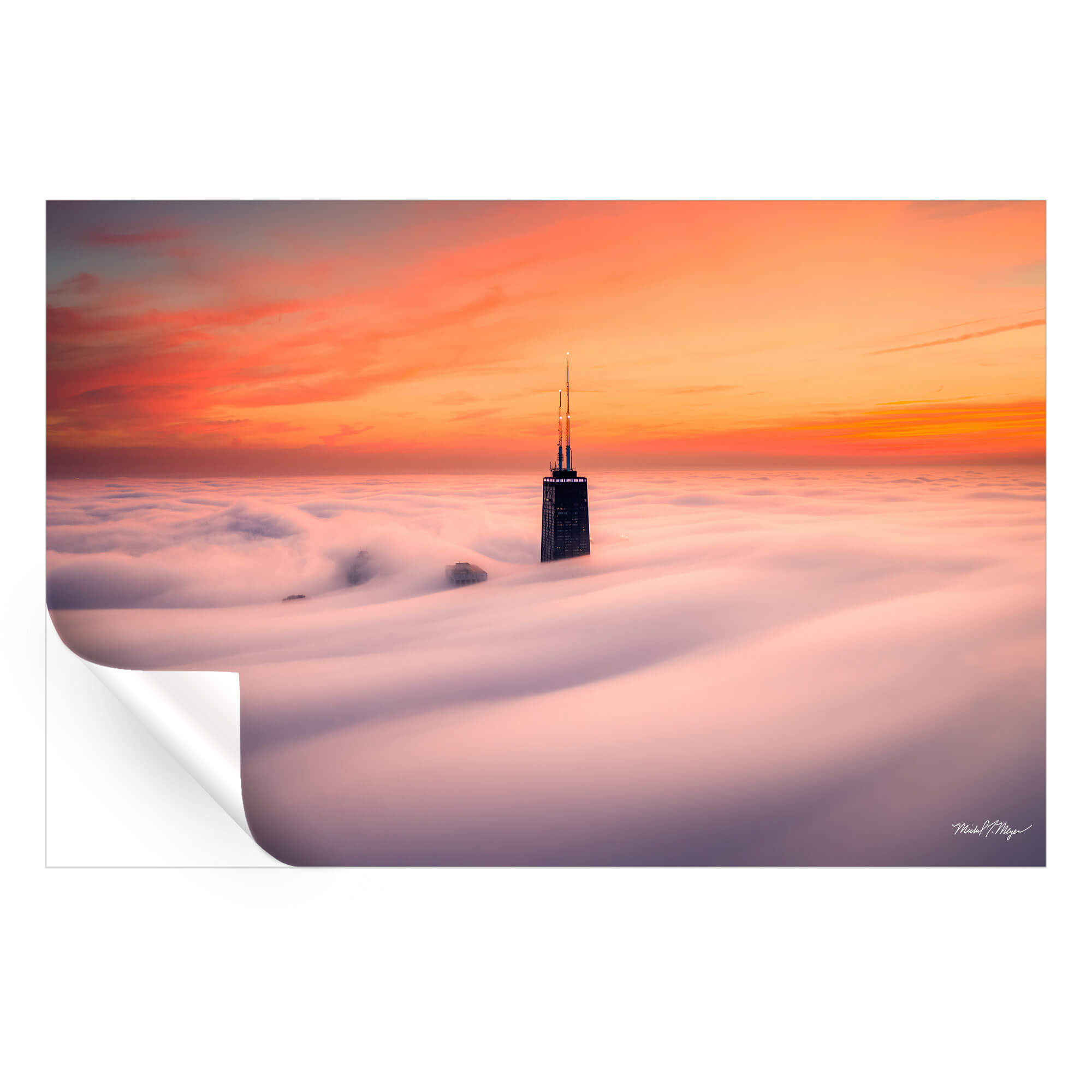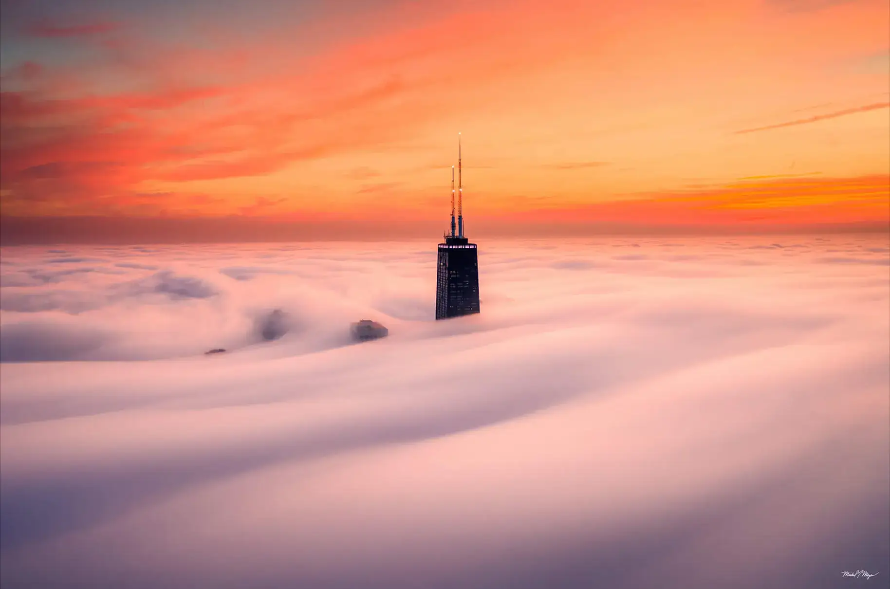 Above a sea of clouds, the iconic John Hancock Center stands as a solitary sentinel against the vibrant canvas of a Chicago sunrise. The clouds blanket the city below, creating an ethereal landscape where the building rises like a monolith.