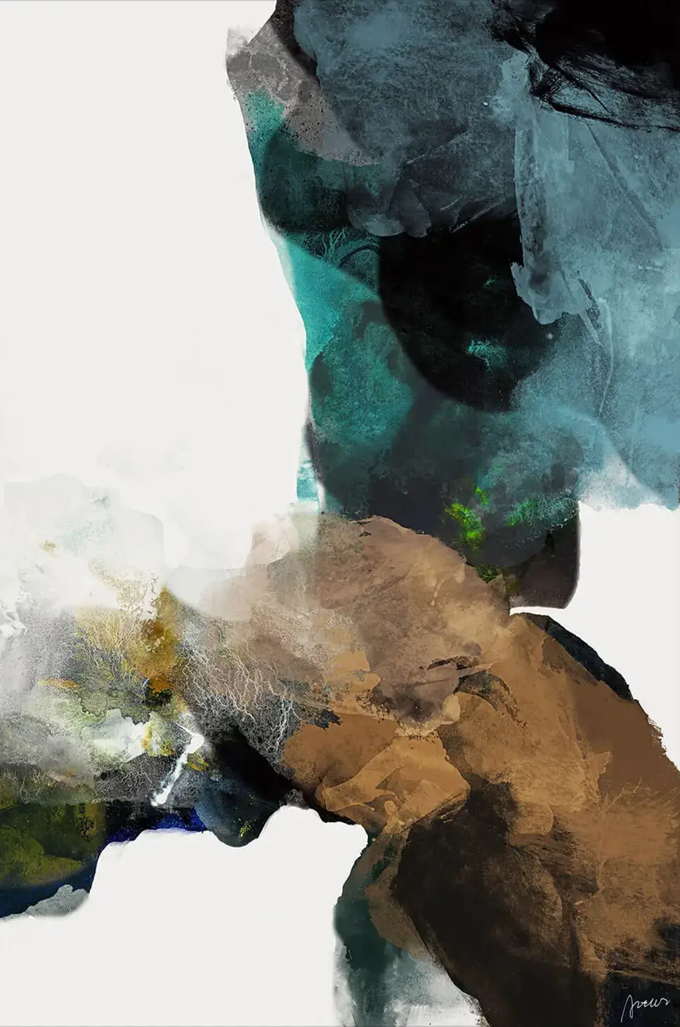 Cool teals and aquamarines meld with a cascade of deep browns and tans, resembling the essence of a rugged coastline. Veins of green and flecks of gold brighten the composition, while the transparency of the layers hint at depth and mystery.