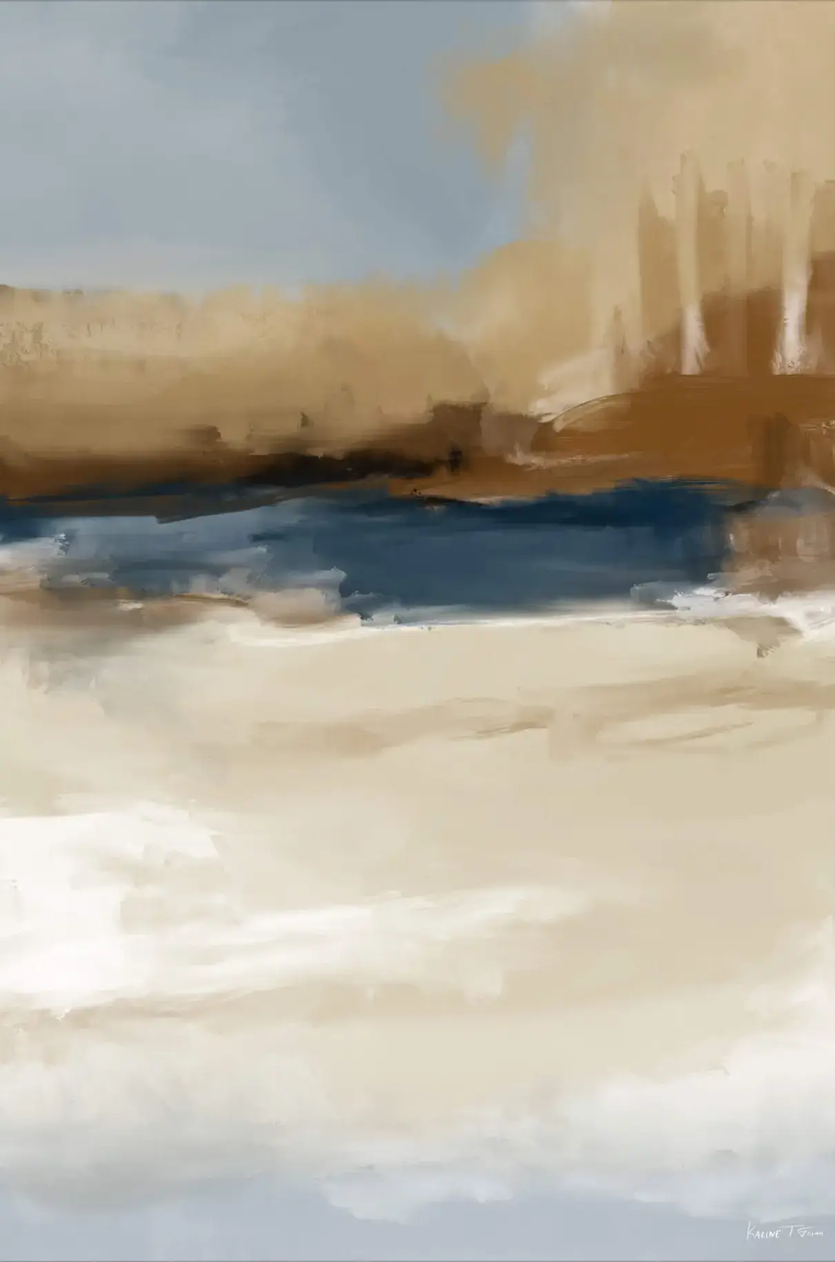 The artwork presents an abstract landscape, where a deep blue expanse, suggestive of water, anchors the composition. Above, warm browns and tans blend and layer, perhaps indicating a rocky terrain. Below, the light beige hues are reminiscent of a sandy shore. The interplay of cool and warm hues, along with the fluidity of the brushwork, creates a sense of natural vastness and open space.