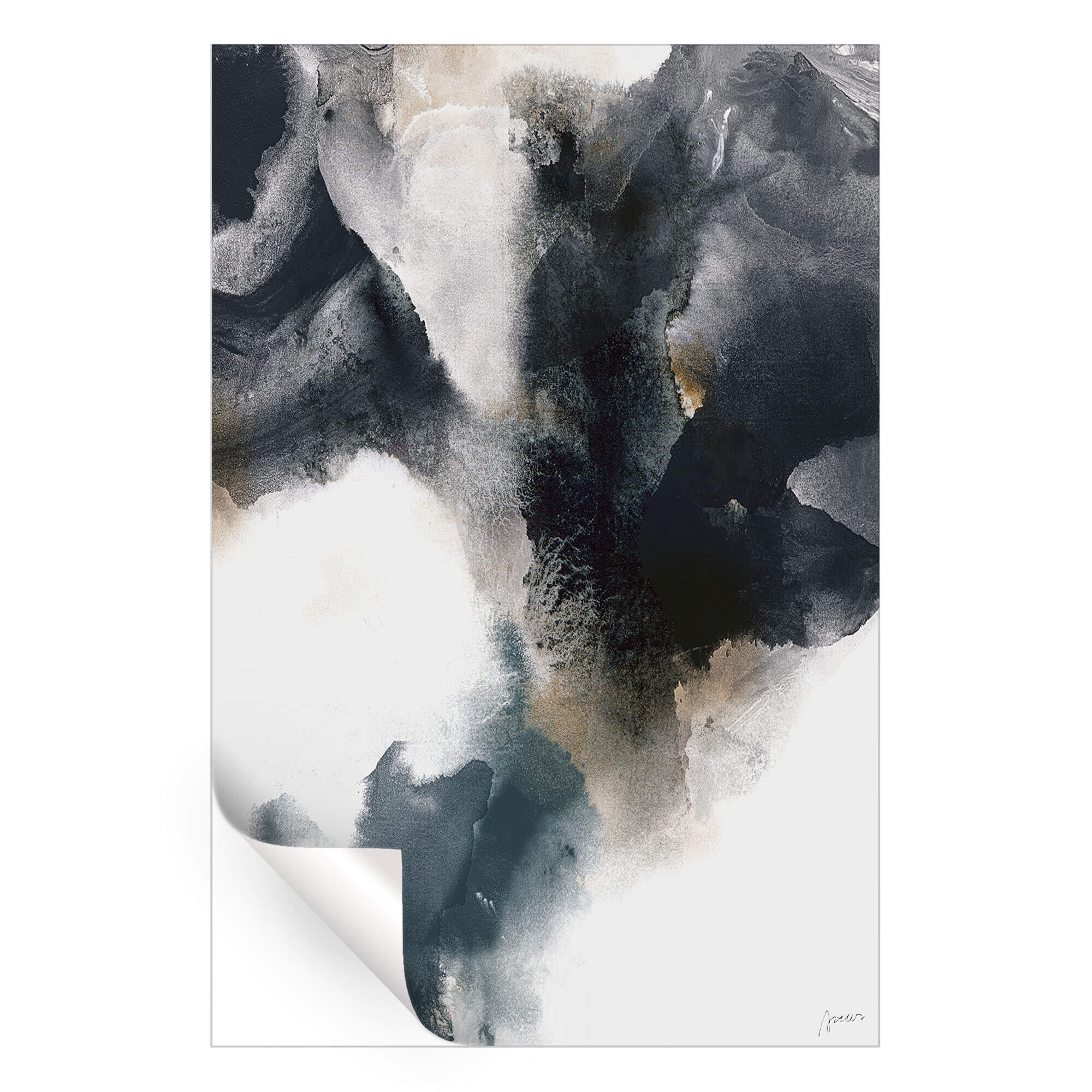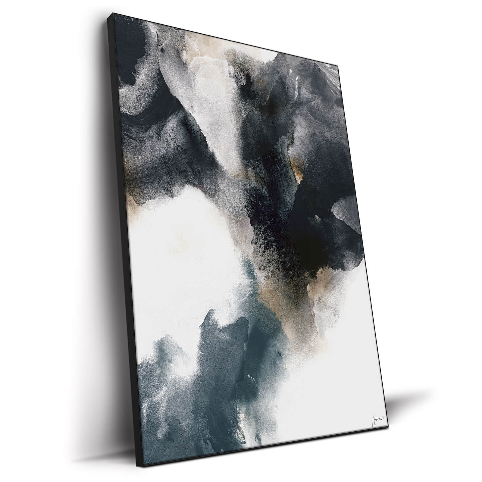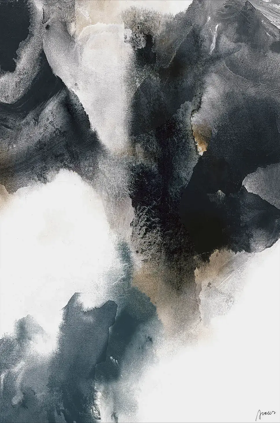 Shades of deep charcoal and soft grey clash and blend with patches of pure white. The textures vary from smooth, mist-like gradients to more intense, stormy areas with heavy applications of color. The composition is reminiscent of a natural phenomenon, capturing the raw power and unpredictability of the elements.