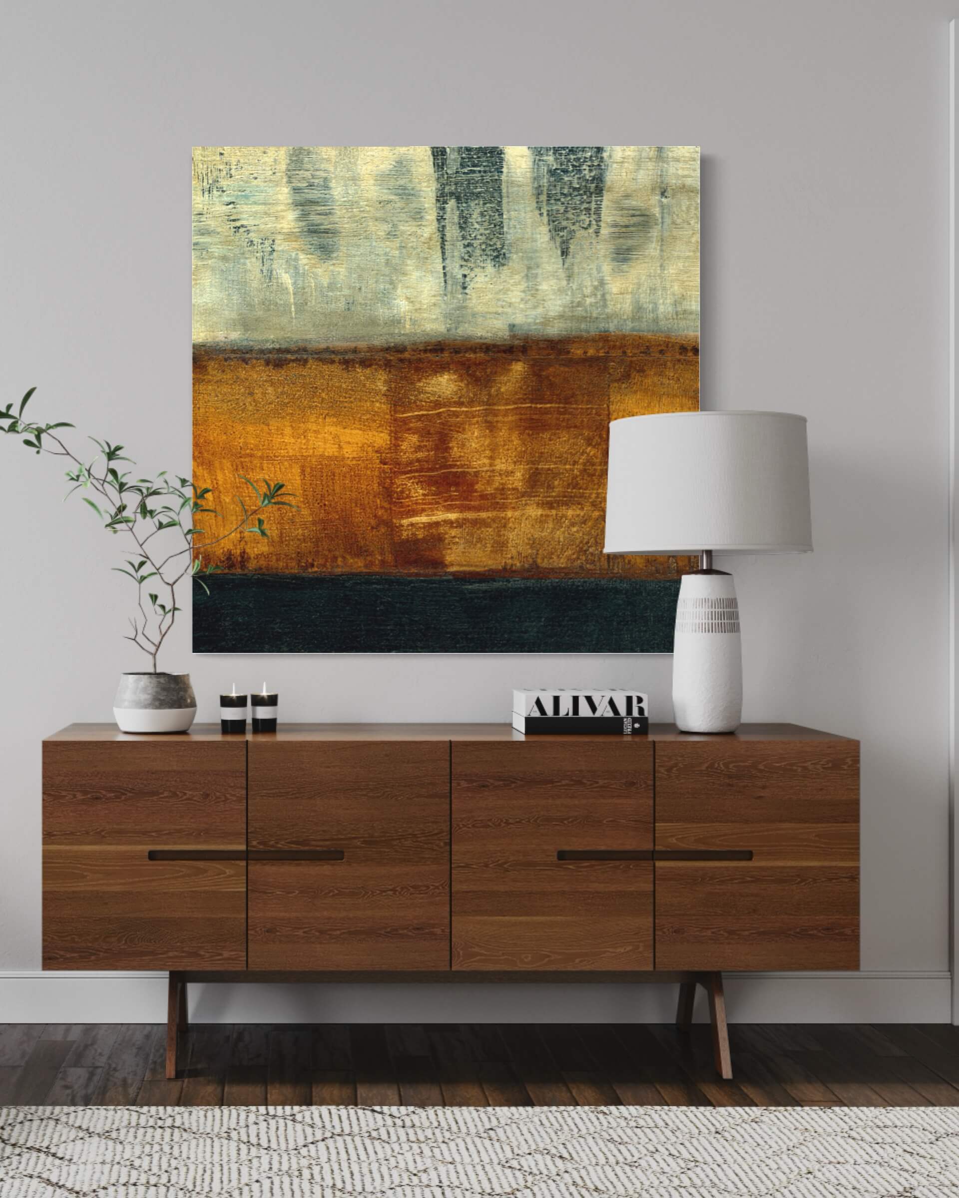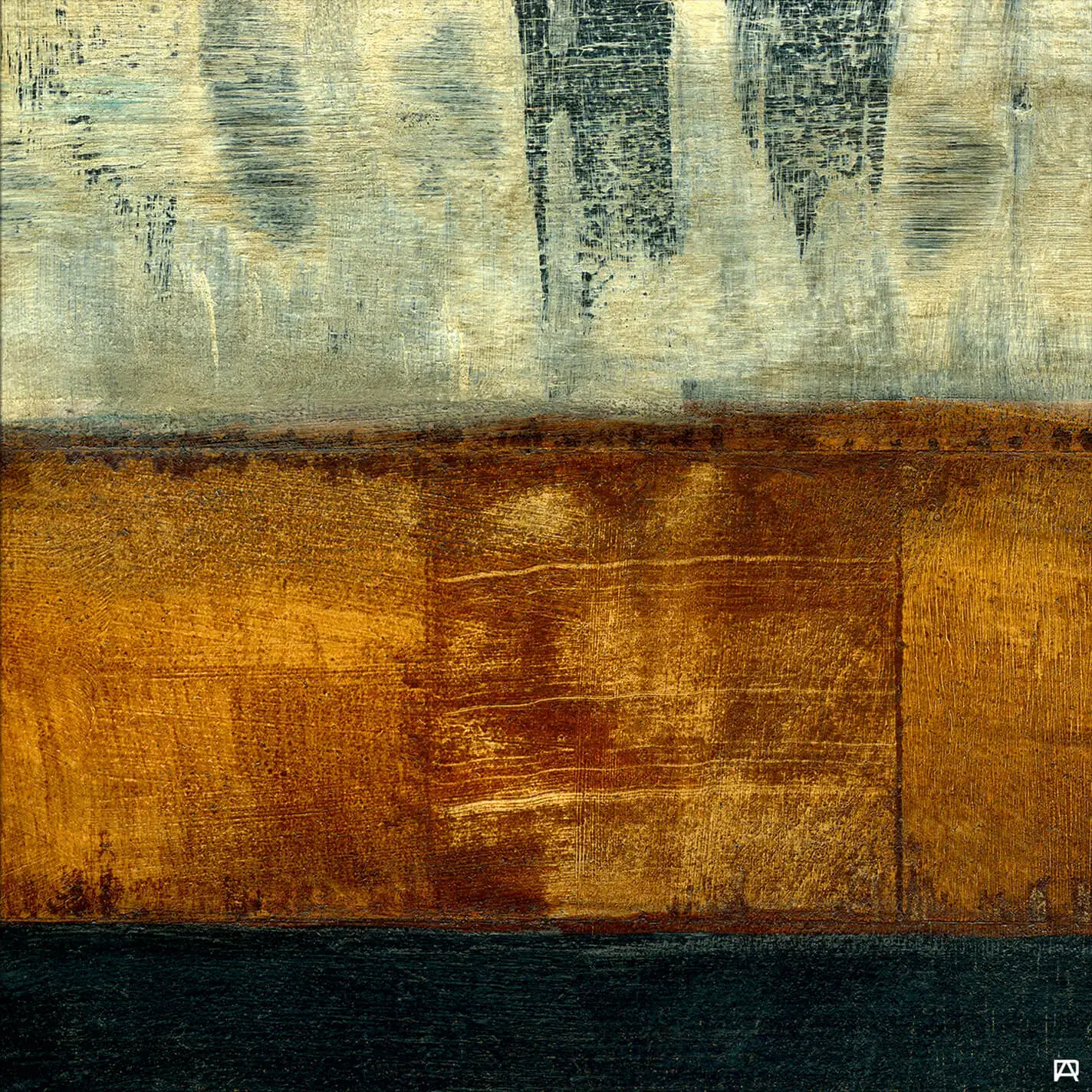 A brown abstract painting with a textured surface, conveying a sense of depth. The composition is divided into three horizontal bands of color: a light, textured color, a wide band of a warm, earthy color, and a deep, dark color.