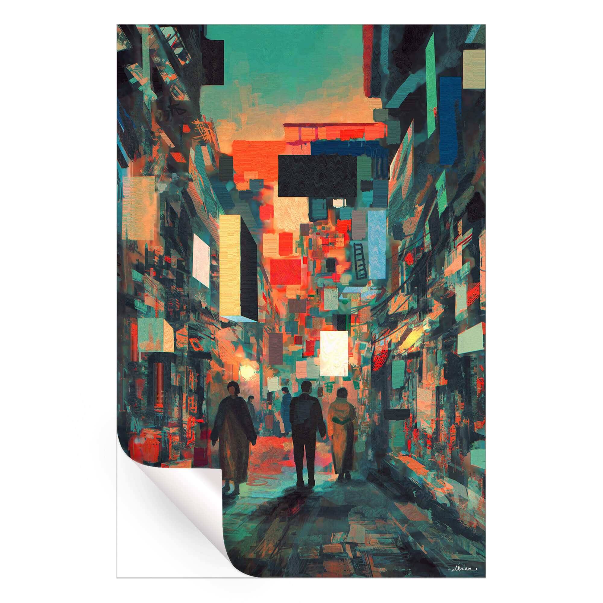 It’s all blocks and streaks here, where the end of the day looks like a party on the walls. This is the city unwinding, all caught up in a piece of wall art that’s as busy and bright as the streets themselves.