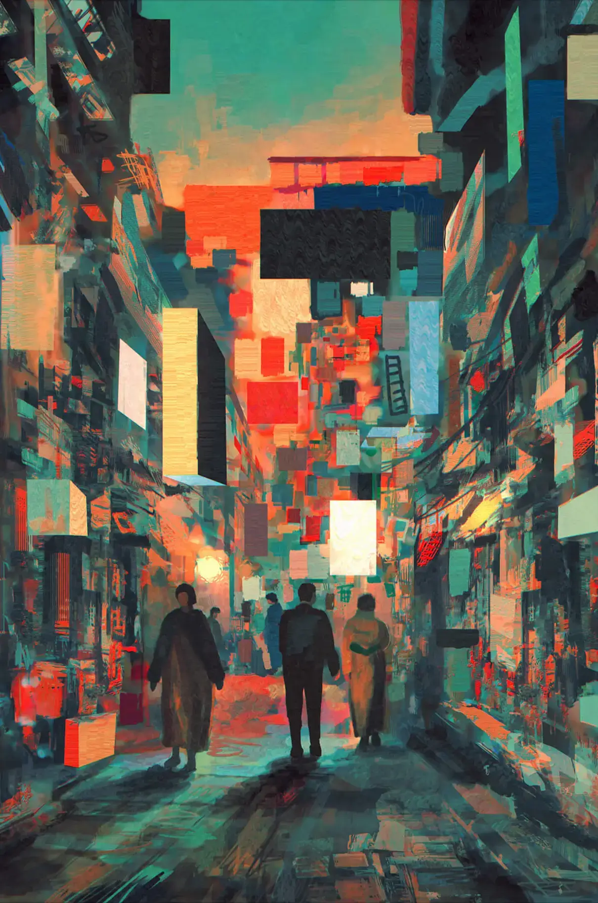 As the sun dips low, the city gets a splash of cool from Daniel Ignacio, turning buildings and streets into a wild mix of sunset colors. People are just shadows against this crazy backdrop, like they’re part of the painting.