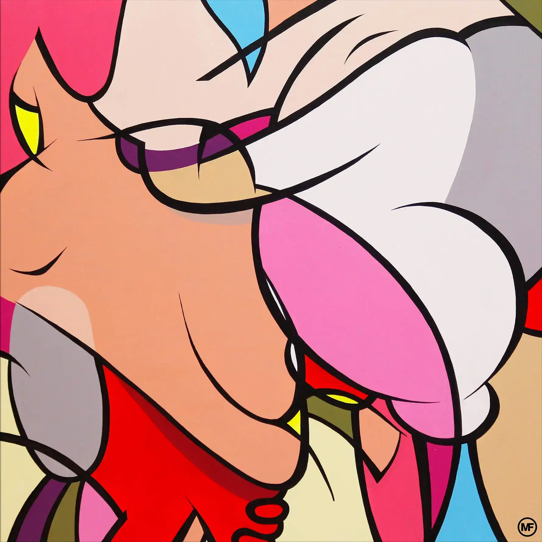 An abstract cartoon composition featuring playful characters and vibrant colors creates a lively and dynamic visual experience. This piece adds a whimsical touch to any space.