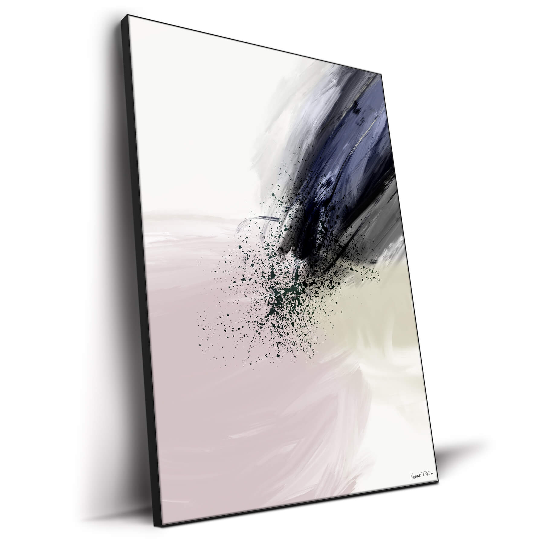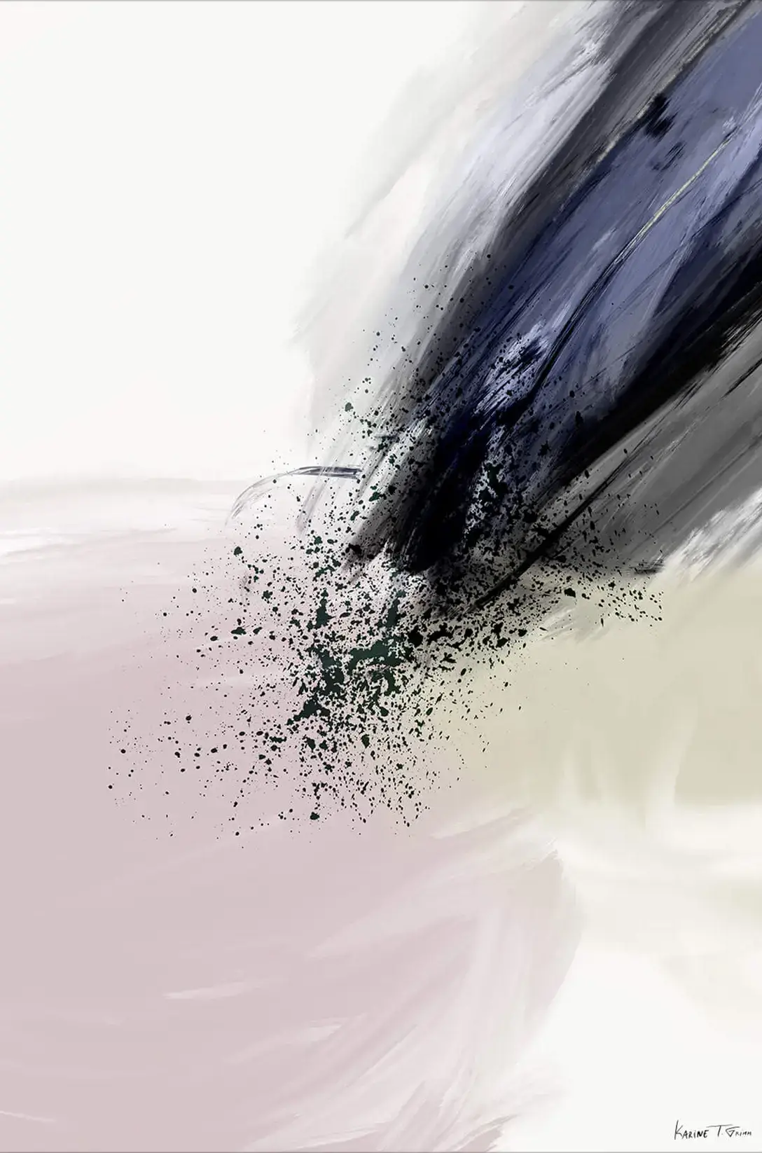 Bold strokes of navy and black cut through the space, trailed by a confetti of speckled paint, like a comet streaking across a sky. The energy of the dark colors is palpable, a force of nature that disrupts the calm of the muted pink hues beneath. This work is a visual representation of movement and impact.