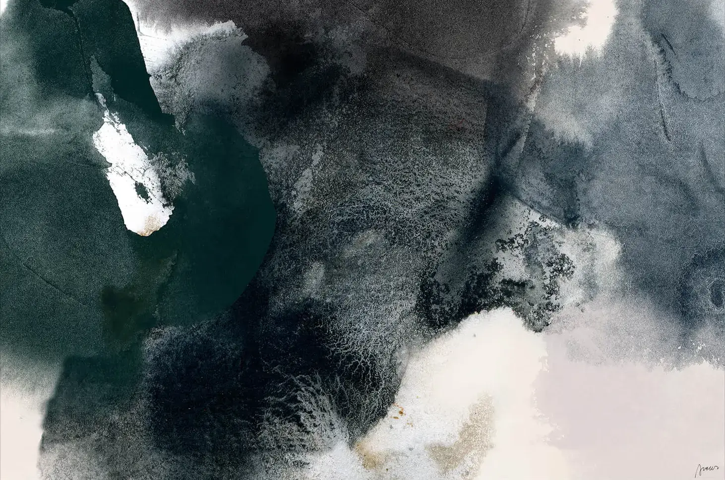 Shades of deep teal and charcoal form a brooding landscape, where the exchange of light and dark creates a dramatic scene. Flecks and patches of white break through the darkness like light piercing through a stormy sky.
