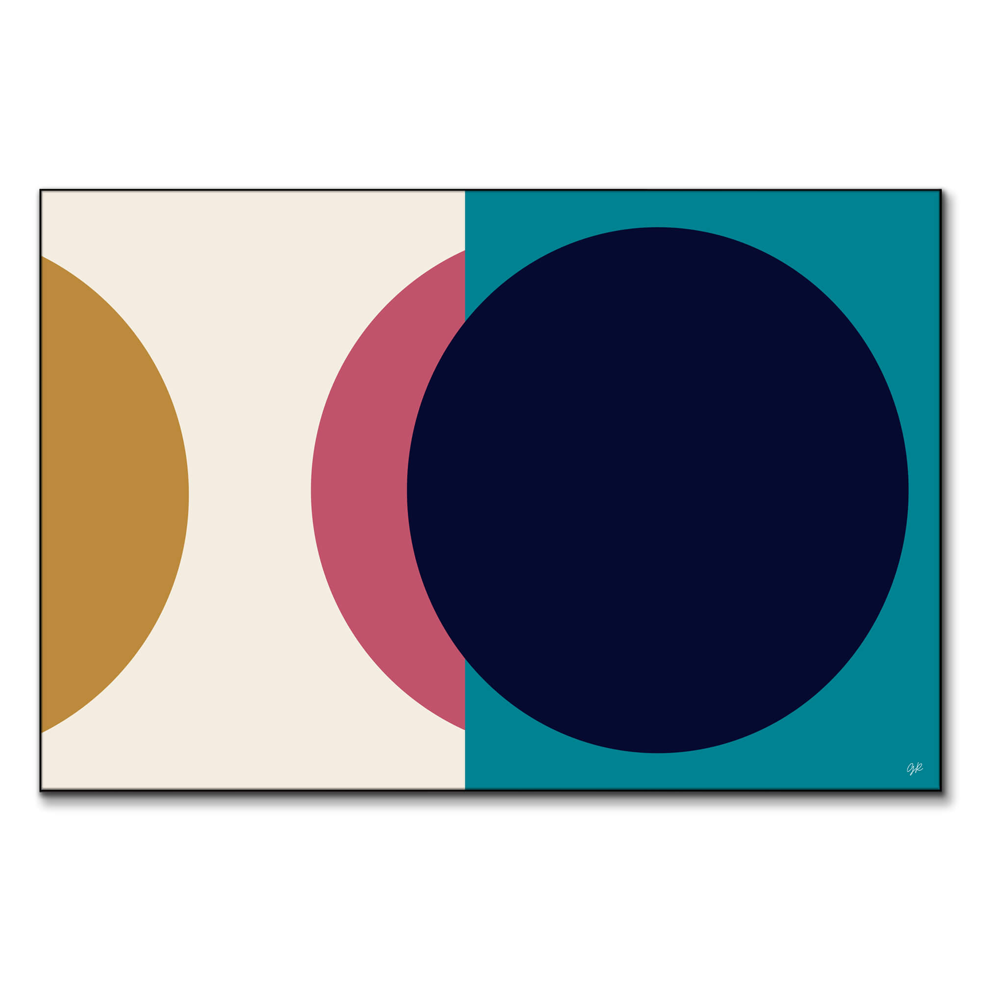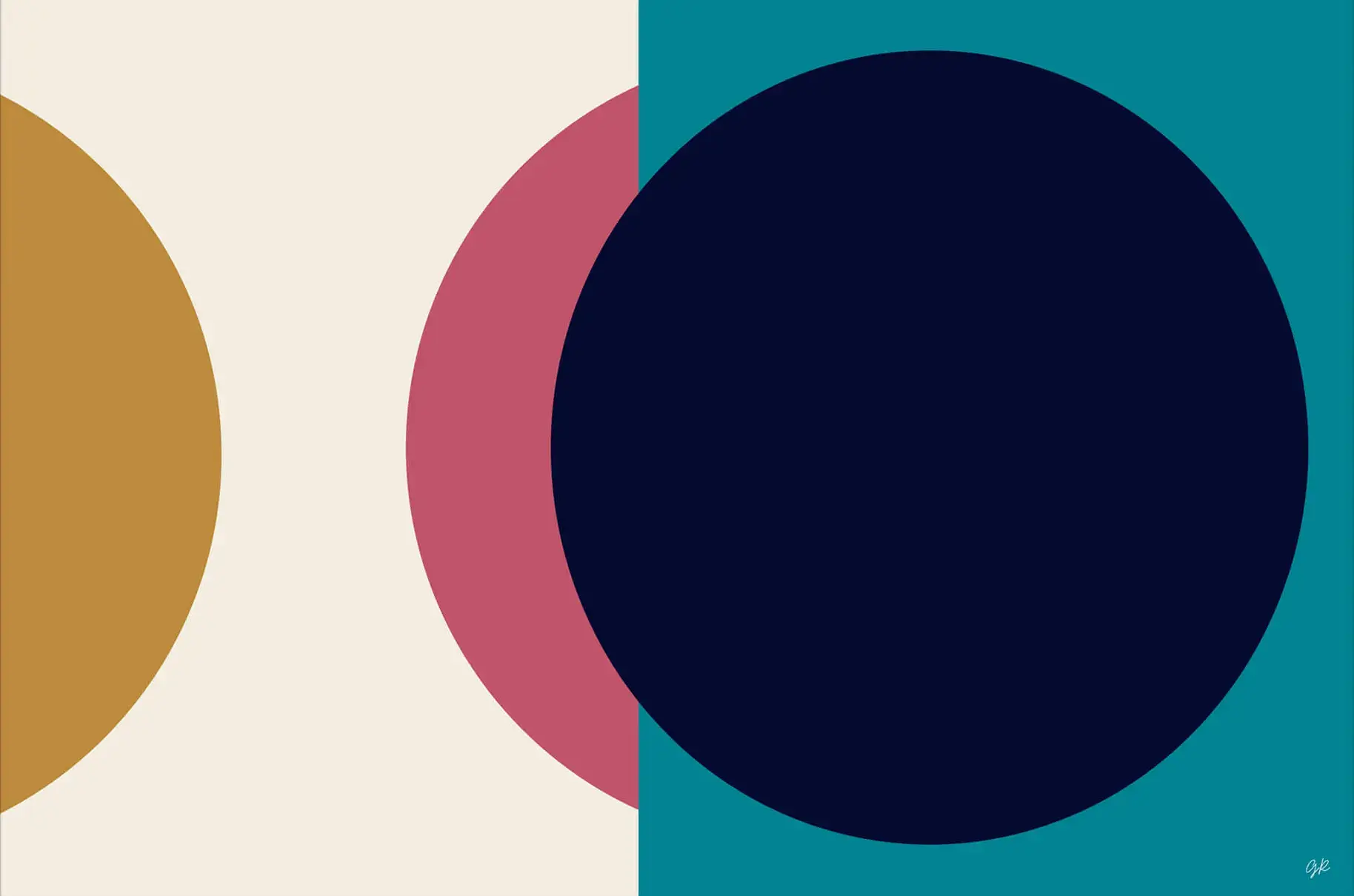 Bold, overlapping circles take center stage against a backdrop of contrasting rectangles. A golden semicircle meets a pink circle, partially obscured by a larger, deep blue circle. This blue overlaps a teal rectangle, creating an intersection of shapes and colors. The cream-colored background provides a neutral space that brings these forms into sharp focus, allowing their simplicity to convey a sense of harmony and balance.