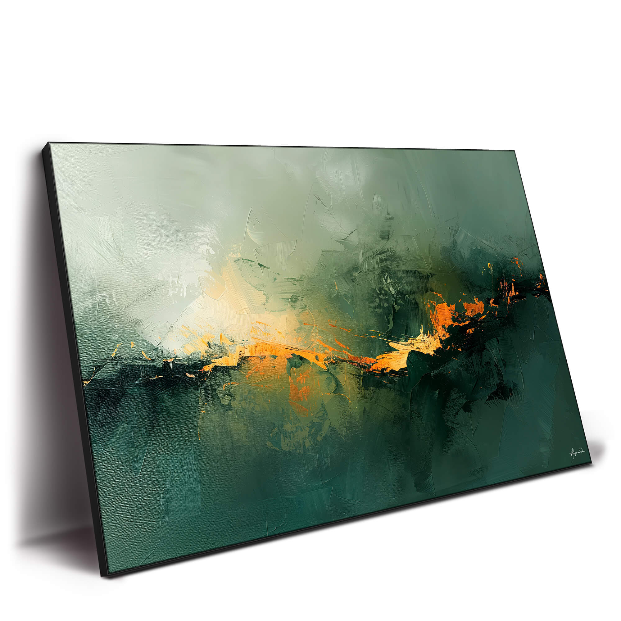 The contrast between the rich greens and the warm, glowing center line keeps your eye traveling from edge to edge. Up close, you can see subtle palette knife marks and layered color shifts that give the surface a tactile, dimensional look. The balance between warm and cool tones brings calm and tension at the same time, making the artwork feel both grounded and alive.