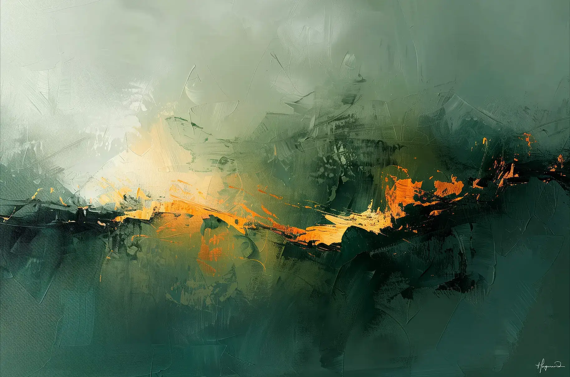 Deep greens move across the piece in layered, textured strokes, creating a moody, atmospheric feel. Softer hazy areas blend into darker tones, giving the impression of depth and quiet movement without defining a specific scene. A vivid streak of orange and yellow cuts across the center, almost like light breaking through mist or energy moving across a horizon.