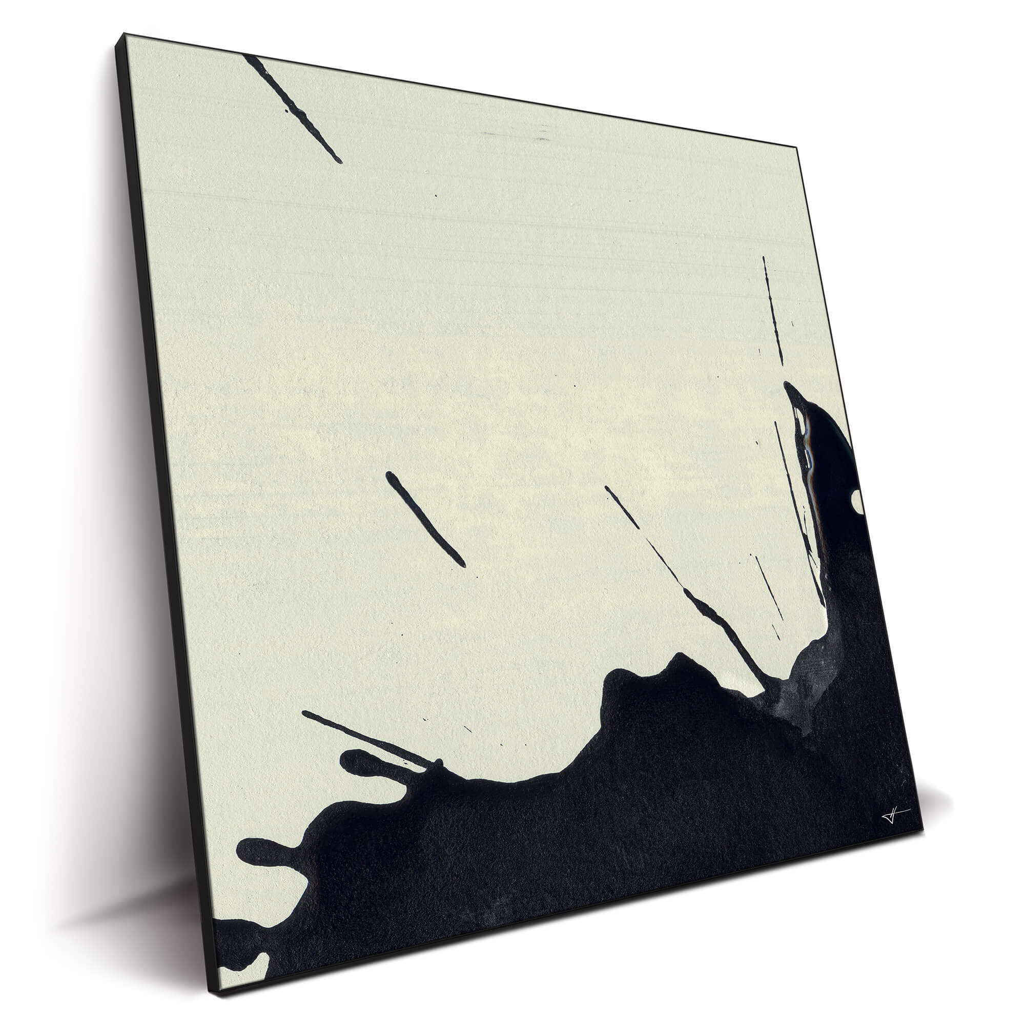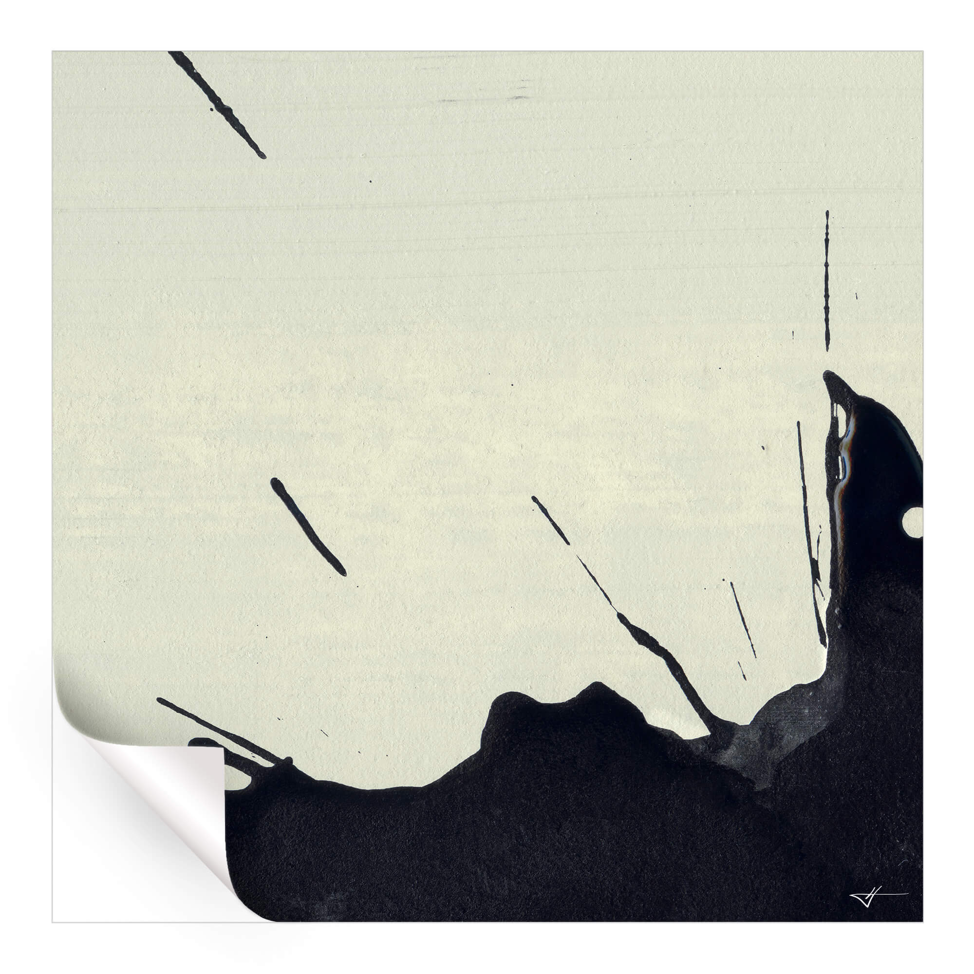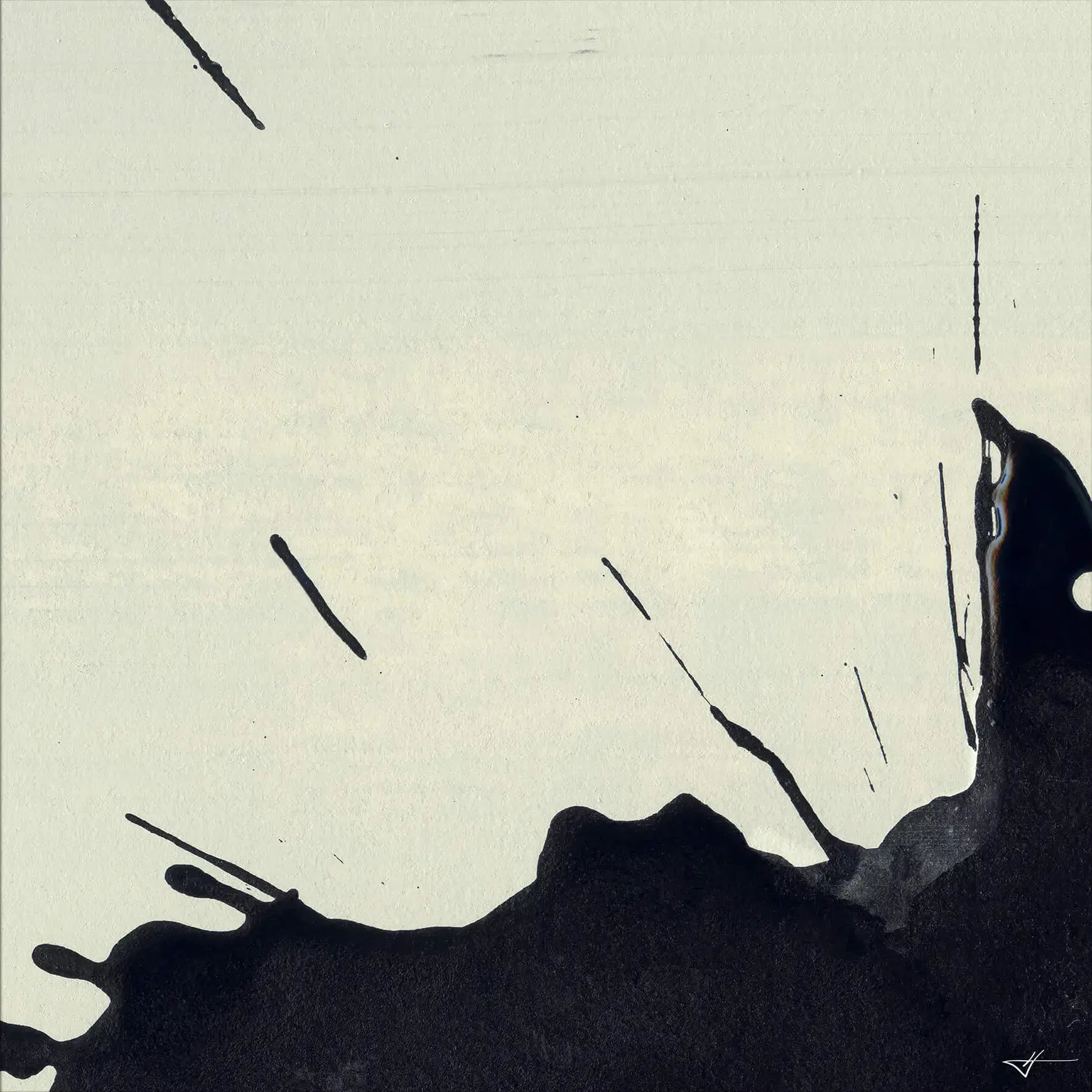 Prominent black ink splatters across a neutral background, the ink spreading outwards in irregular patterns. The splatter’s dynamic nature and the contrast between the deep black and the soft background create movement. The impactful use of negative space are highlighted in this abstract composition.