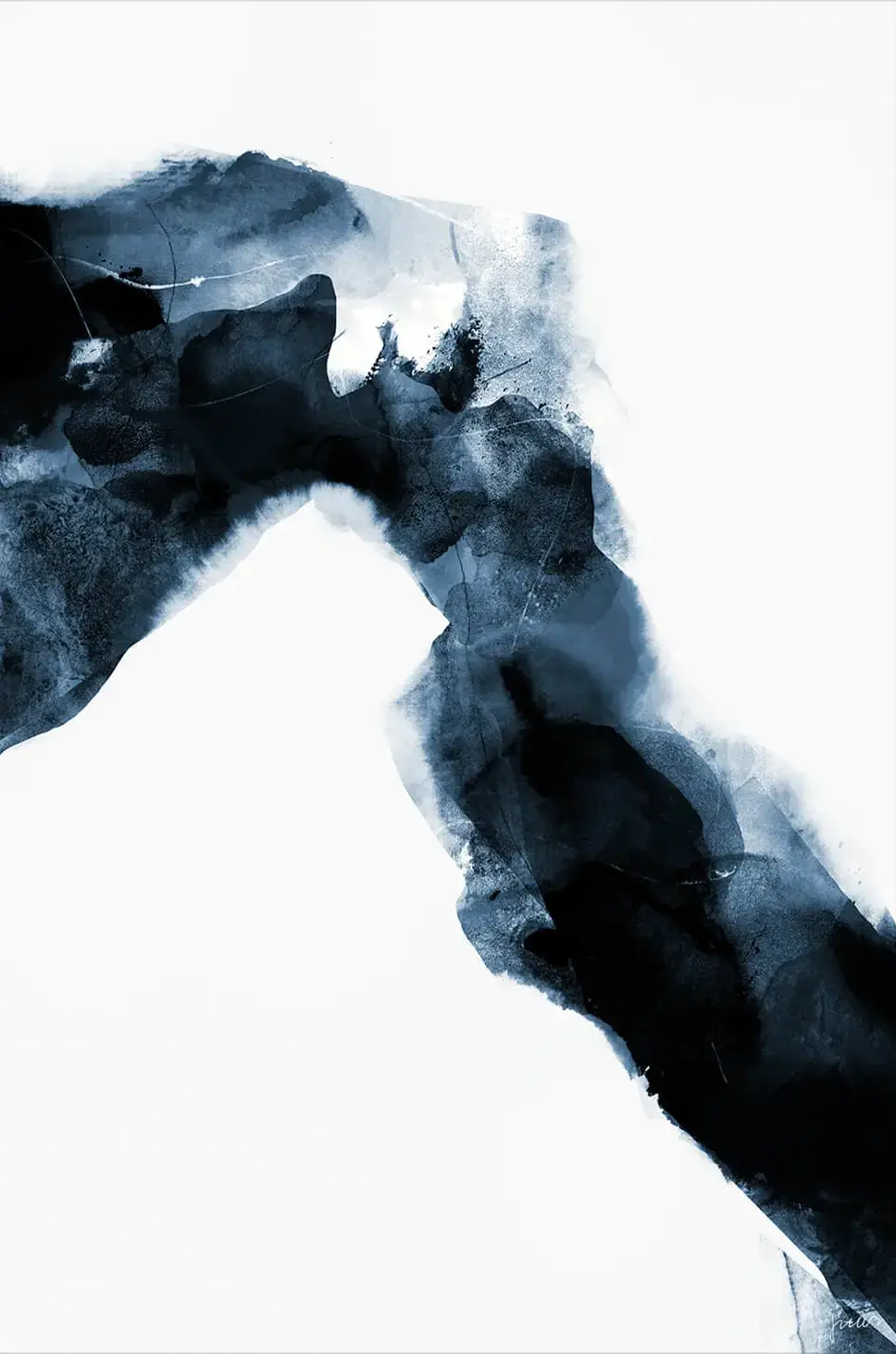 Deep midnight blue bleeds into airy white, creating a sweeping arch that recalls mist over mountain ridges. Shadowy layers of pigment stack like weathered stone while softer washes fade at the edge, giving the print a cloudlike lift. Negative space dominates the upper and lower thirds so the eye follows the inky ribbon in a gentle vertical climb. The texture hints at watercolor yet remains crisp thanks to high definition printing. Subtle granulation within the darkest fields suggests worn history, which inspired the title. Hints of charcoal gray soften the transition between tones and keep the artwork calm. The composition feels weightless even at the largest 72×108 in size.