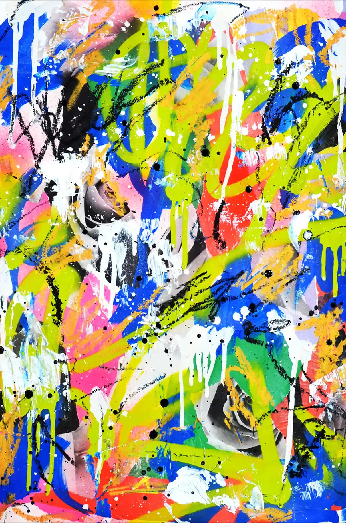 Splashes of neon yellow, bright pink, blue, and green intersect and overlap in an energetic display, peppered with black and white drips. The abstract composition is reminiscent of graffiti with its spontaneous and expressive application of paint.
