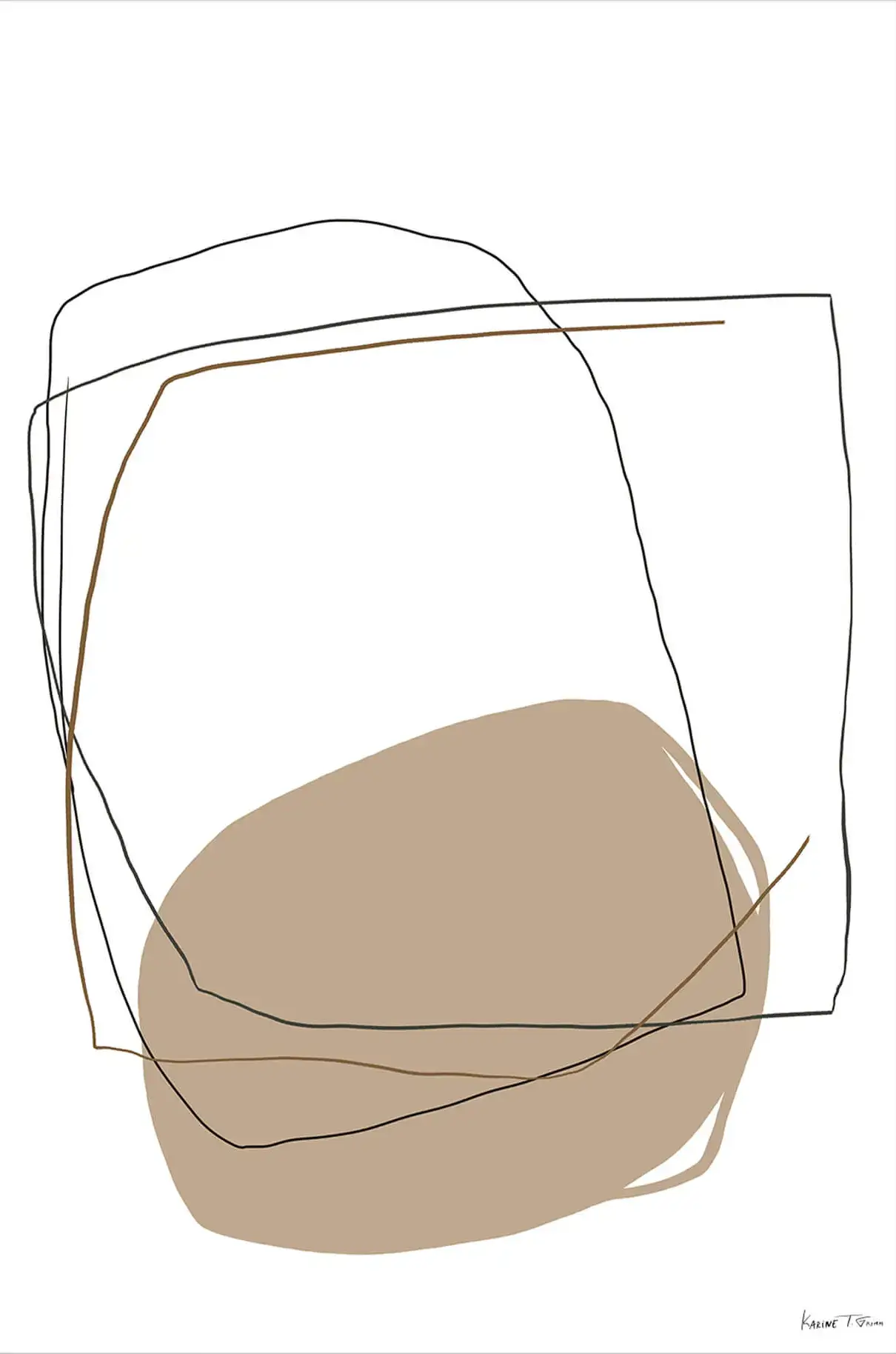 Simplistic in form, this piece features slender lines in black and a singular, caramel-hued line that trace the contours of an abstract, geometric shape. A filled, soft-edged shape in a muted taupe floats amidst these contours, creating a focal point that grounds the composition. The sparse use of color and the openness of the design lend a calm, orderly feeling to the piece.