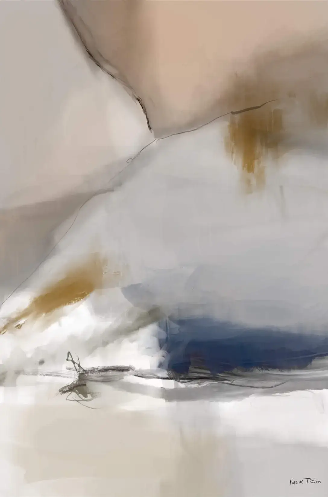 This abstract artwork explores the fusion of soft earth tones and deep blues, creating a soothing and grounded visual experience. The subtle play of beige, tan, and navy elements are layered with light strokes and bold lines, suggesting both stability and motion.