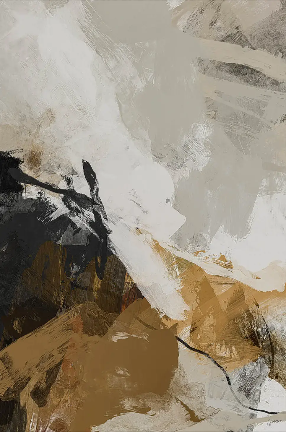 Warm browns, soft beige, and muted gray move across the canvas in loose, textured strokes, giving this piece an earthy, grounded feel. It has that raw, layered look that feels like nature and weather shaping a surface over time. Light areas fade into deeper tones, kind of like sunlight hitting rock and soil before dipping into shadow, keeping things calm but still full of movement.