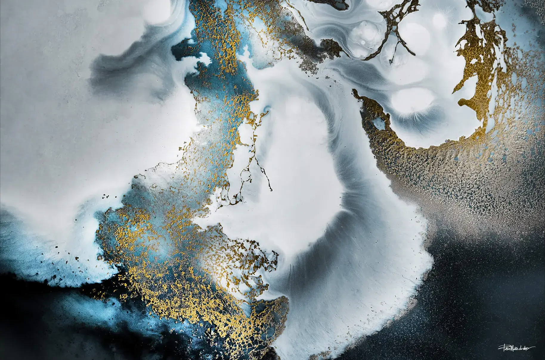 Swirling oceanic blues merge with the deep contrasts of black and white, while golden accents ripple through the composition. This piece evokes the movement of water, with soft fluidity and subtle elegance, capturing the mesmerizing beauty of the sea. The addition of gold highlights brings a luxurious touch, contrasting the cool tones and emphasizing the abstract forms within the painting.