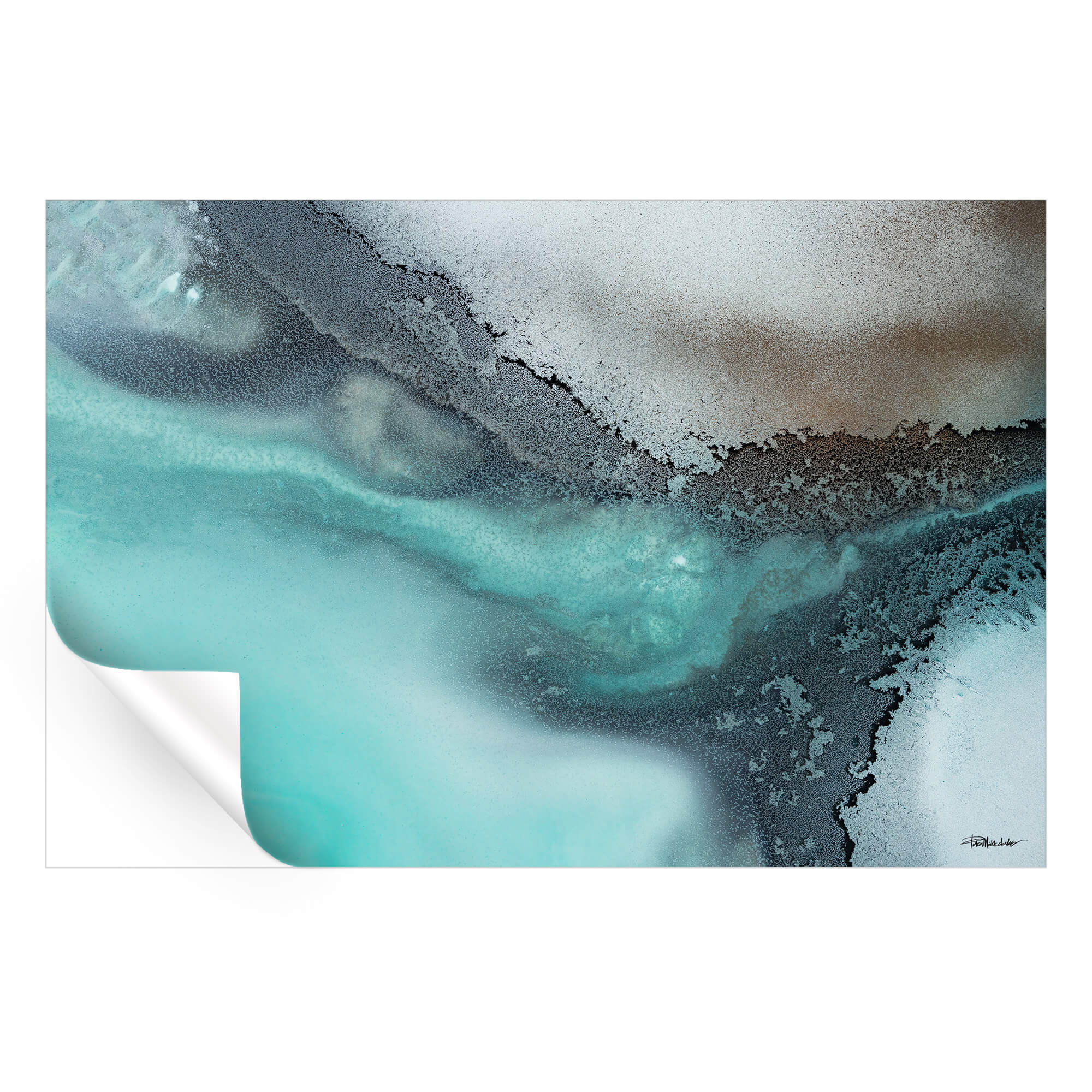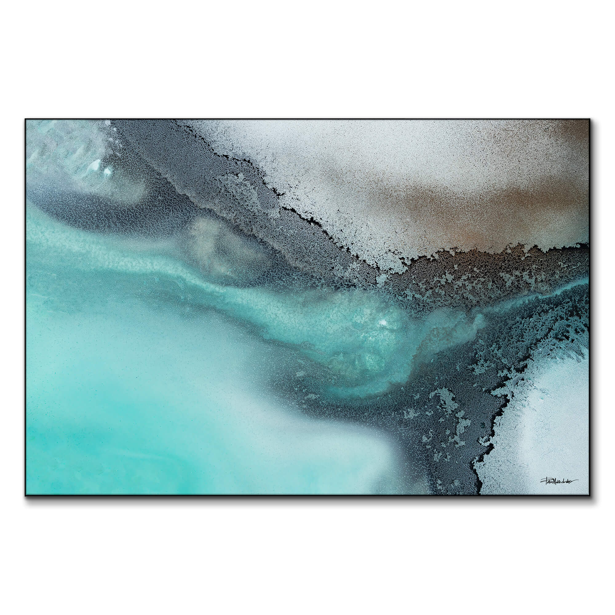 This abstract oceanic painting combines cool turquoise tones with muted grays and whites, creating a visual representation of water meeting land. The soft gradients and intricate textures evoke the calm and quiet beauty of coastal shores. The subtle contrast between light and dark shades adds depth to the piece, making it ideal for modern, minimalist, or nature-inspired interiors. The fluid lines and soothing palette offer a tranquil aesthetic, perfect for spaces where calm and elegance are desired.