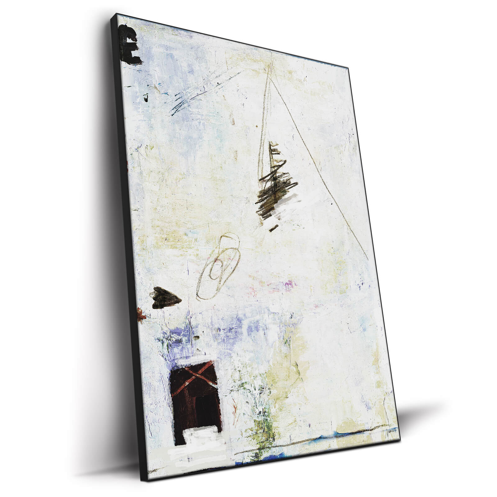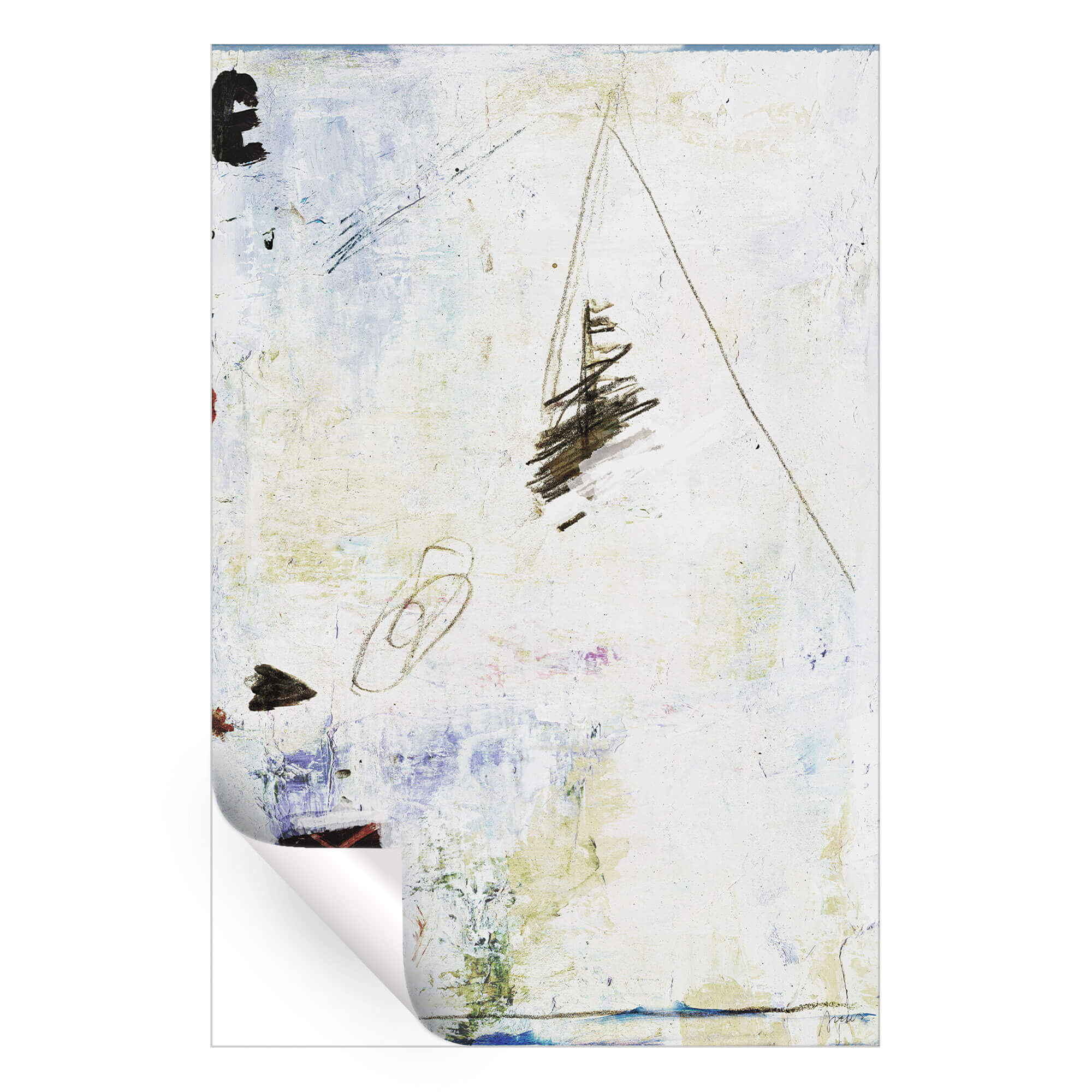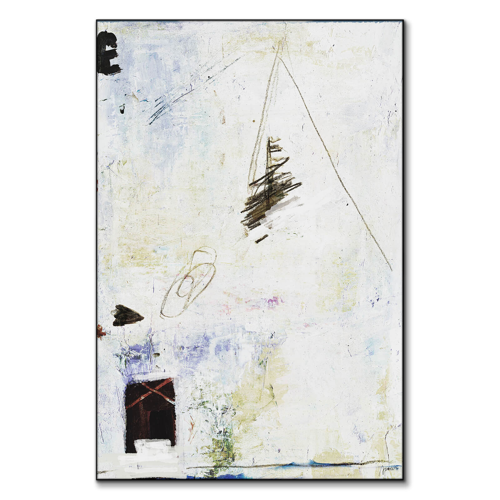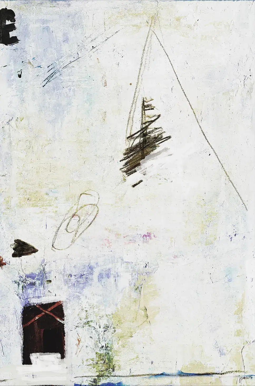 Amid a textured expanse of off white, abstract forms hint at a narrative caught in frozen motion. Dark strokes climb upwards while softer shapes below suggest shadows and structures. Here, splashes of color and the rugged texture of the backdrop mingle, crafting a scene that is both a fragmented memory and a timeless landscape.