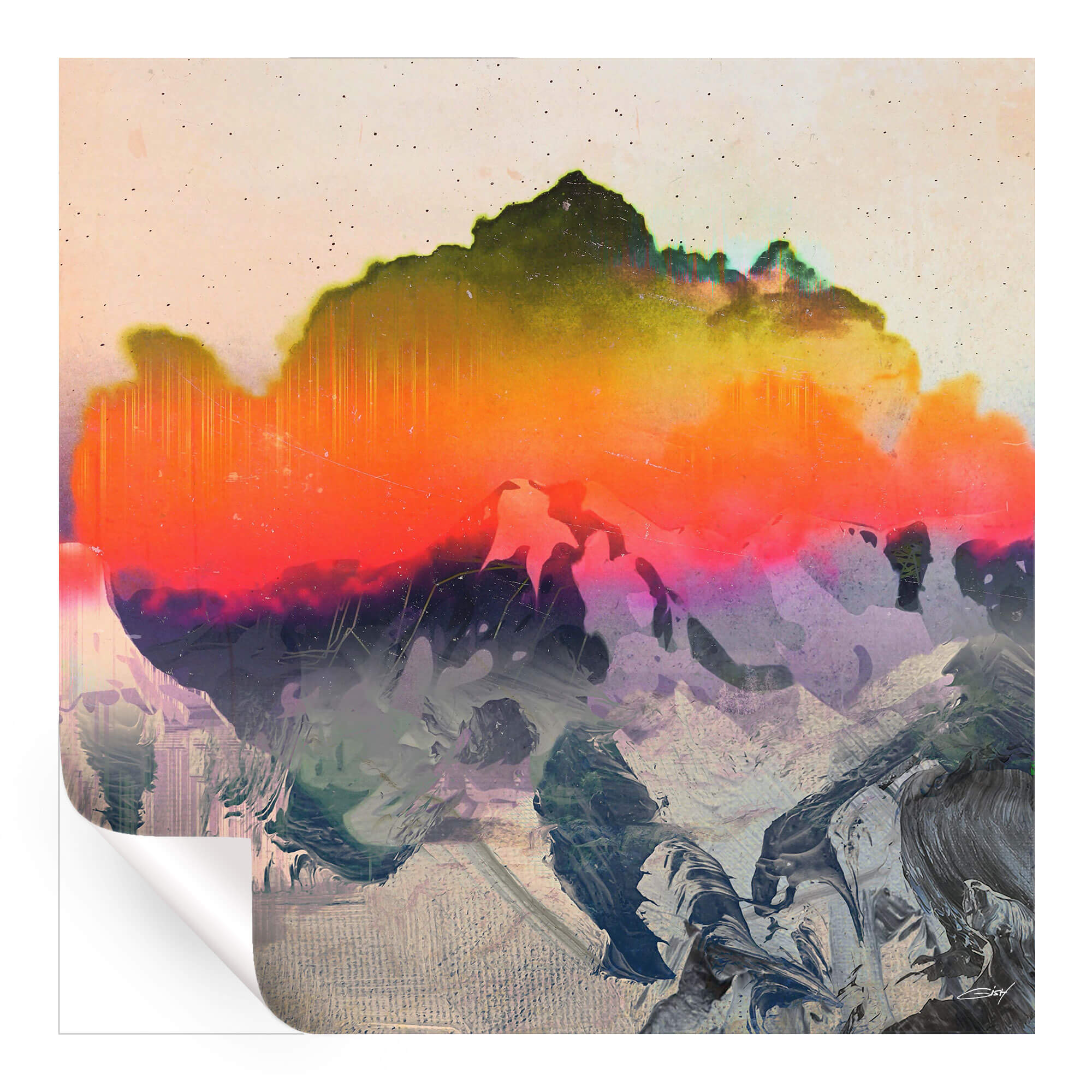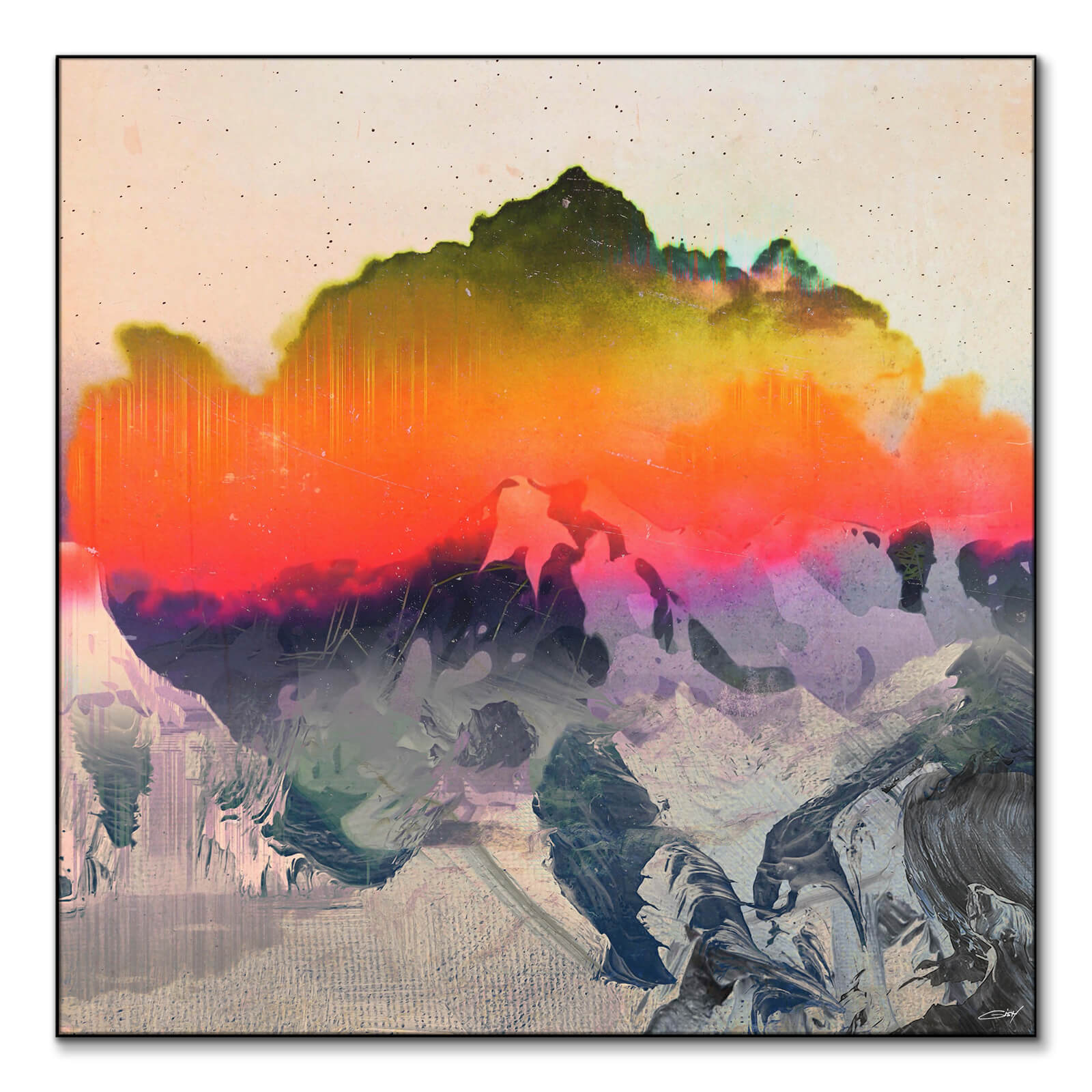 A dramatic, dreamy cloud is composed of vibrant, warm colors which transition into a cooler, greenish hue. Below this lays a tumultuous landscape, with abstract forms that resemble rocky outcrops mountains. The use of gray on the form contrasts with the vivid sky.