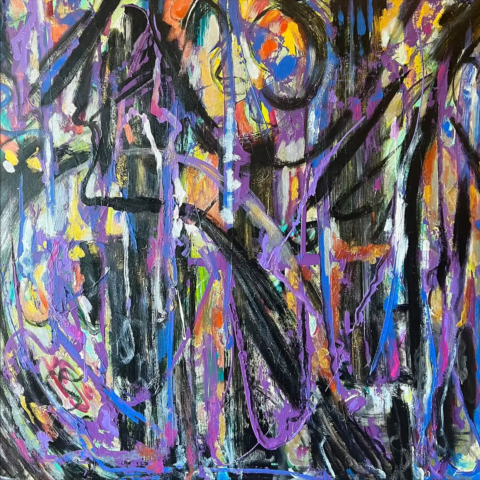 A swirl of deep purples and bold blacks sets the stage for a striking visual experience, with sudden bursts of orange, yellow, and blue bringing a lively contrast. Bob Lombardi’s touch is evident in the energetic strokes and abstract shapes that suggest the complexity of a city at night.