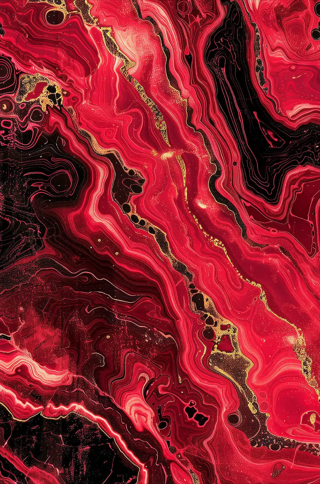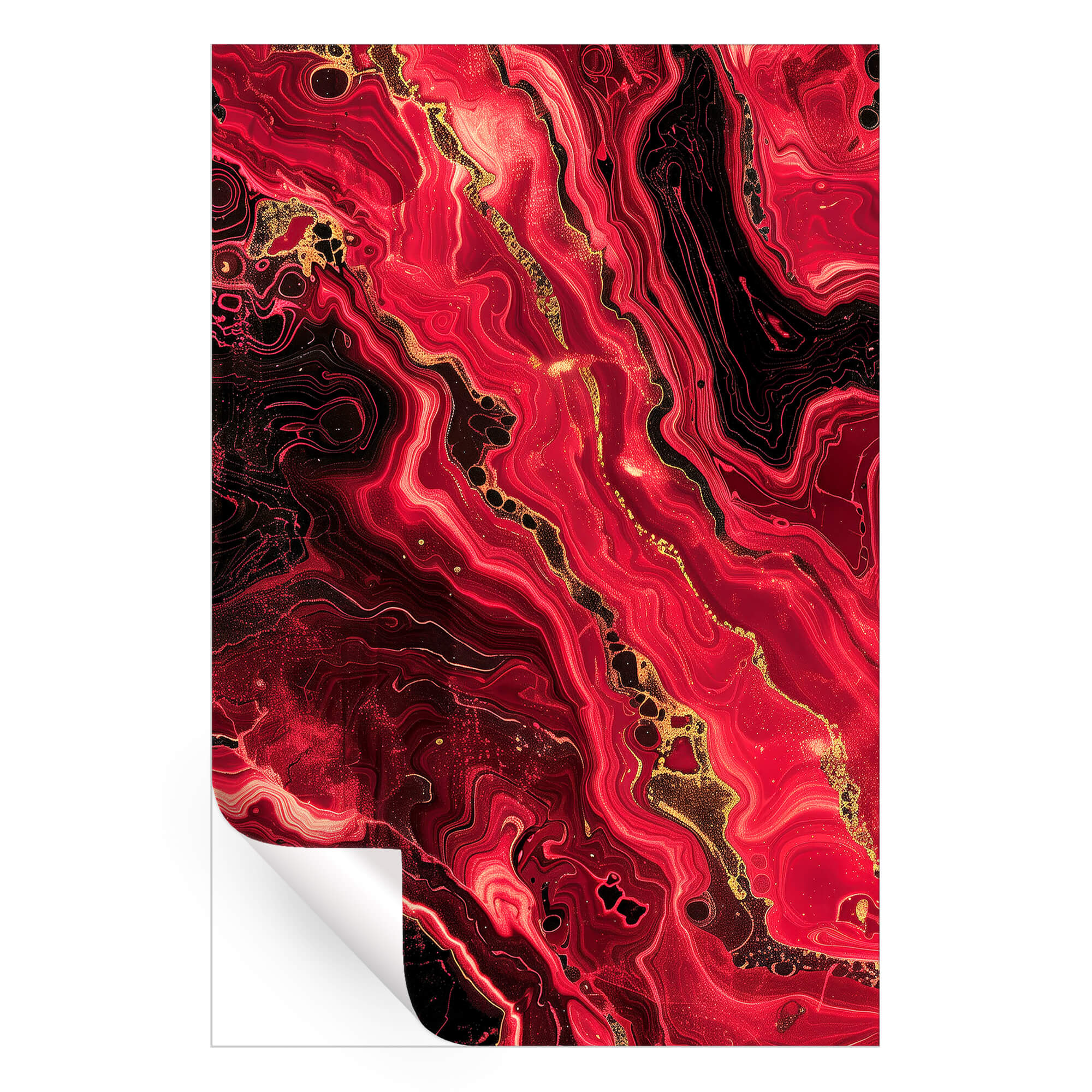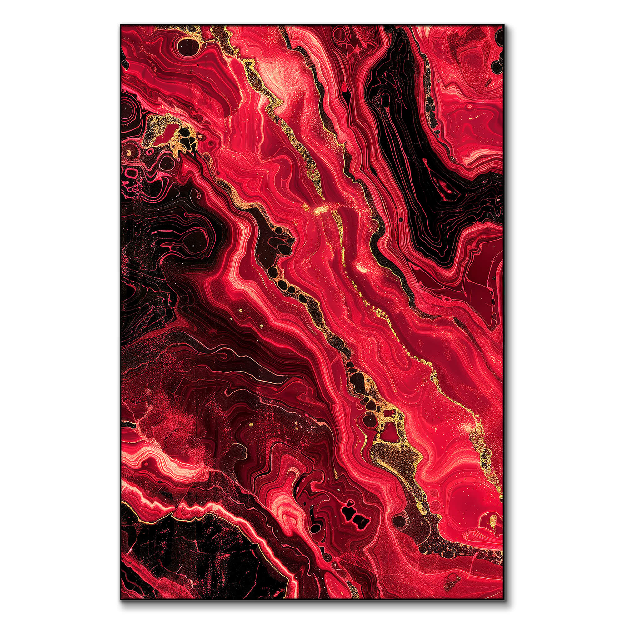 This striking composition blends fluid movement with rich, fiery hues, creating a mesmerizing sense of energy and depth. Bold red tones swirl with deep blacks and shimmering gold accents, evoking the raw beauty of molten lava or flowing liquid metal. The intricate patterns and organic textures make this piece a dynamic focal point for any modern space.