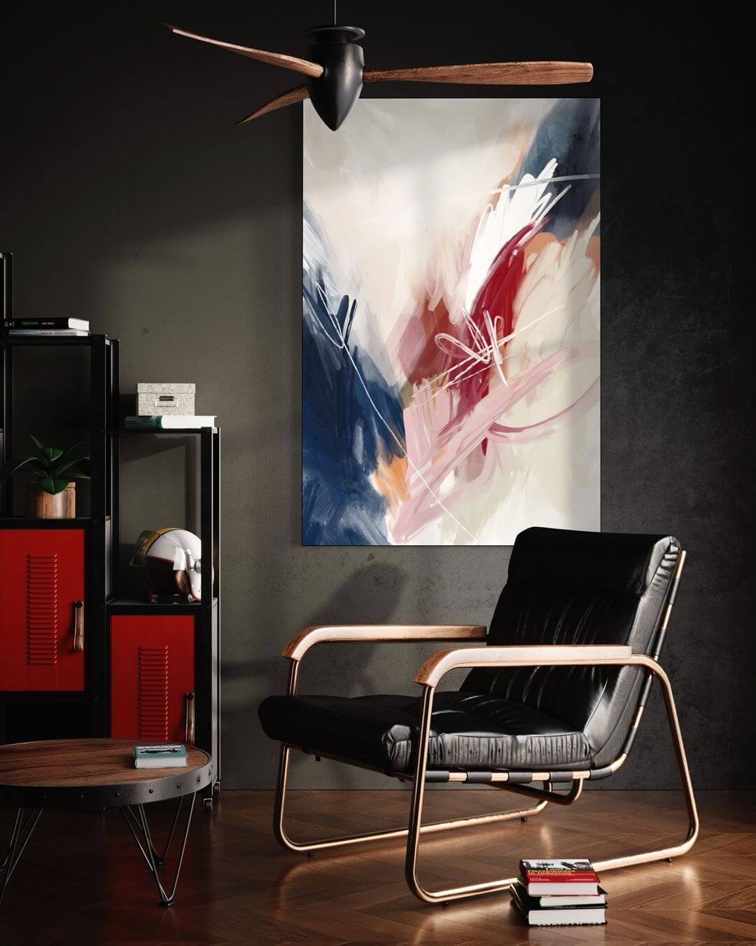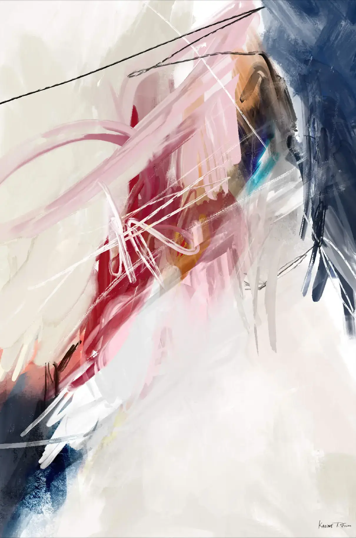 Vivid strokes of navy and crimson clash and converge with gentle pinks and muted whites, creating a vibrant dance of color and emotion. Energized lines criss-cross, forming a visual rhythm that is both chaotic and harmonious. Amidst the bursts of deep blues and reds, a tranquil space of white offers a respite, a quiet center in a storm of chromatic movement.