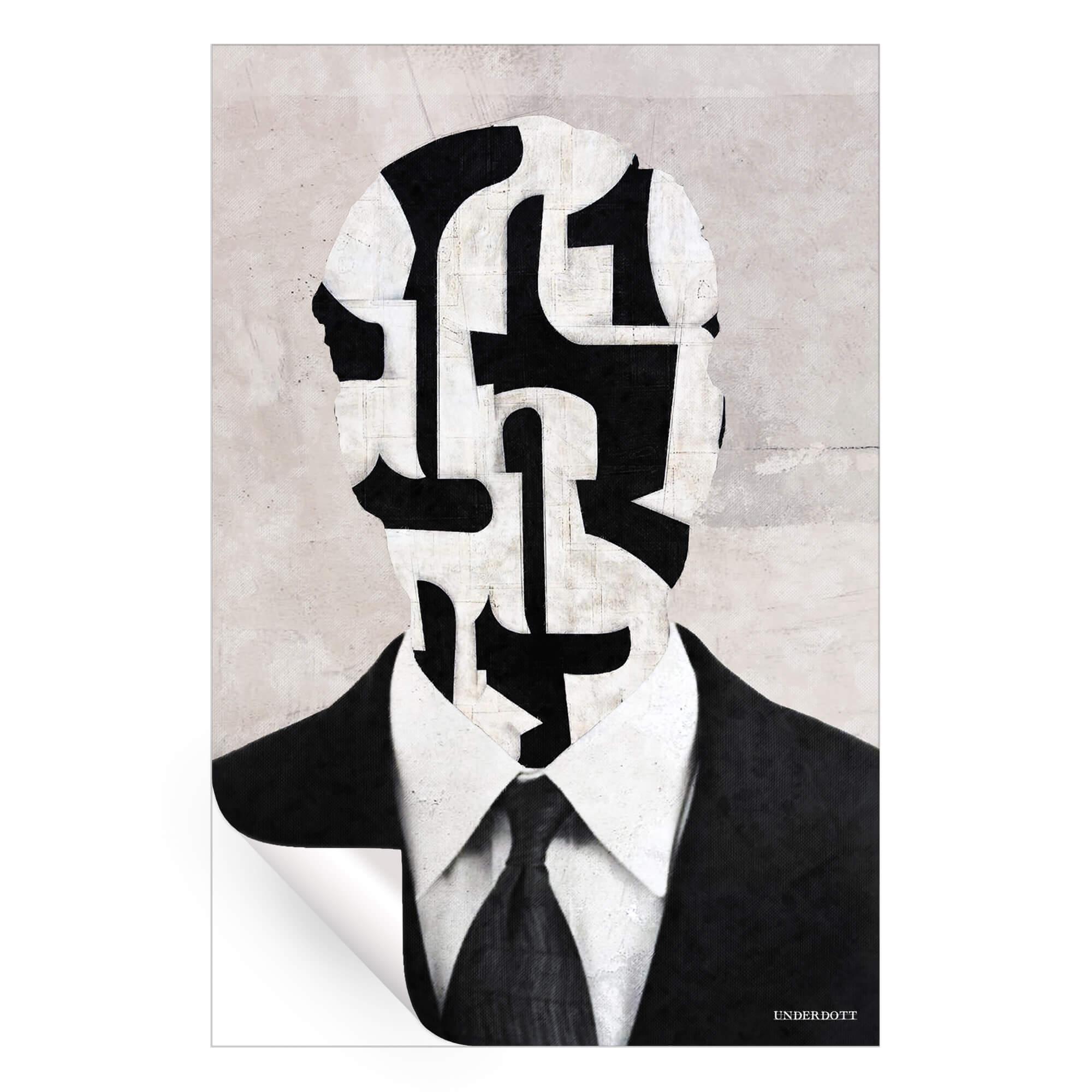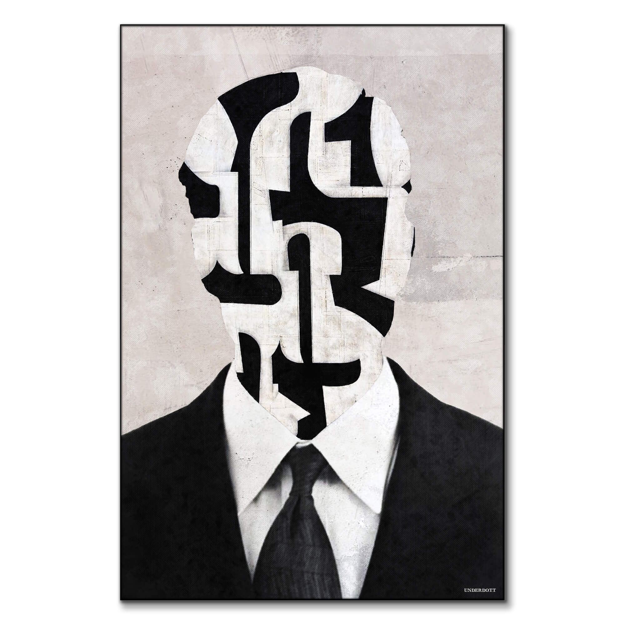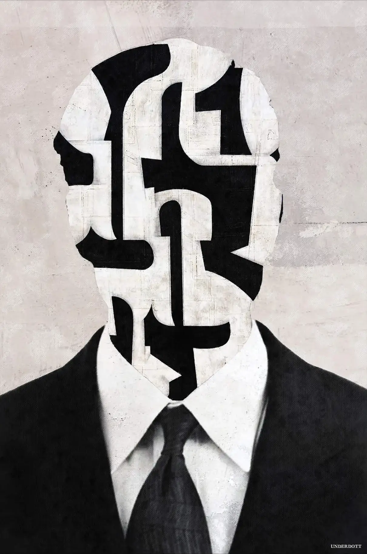 A sharply tailored suit and tie anchor the lower half of the composition, yet the head dissolves into bold black shapes divided by soft off-white pathways. Each contour feels like a fragment of a geodesic maze, inviting the eye to wander through interlocking corridors. Subtle concrete textures hover in the pale background, adding quiet depth that balances the high-contrast foreground.