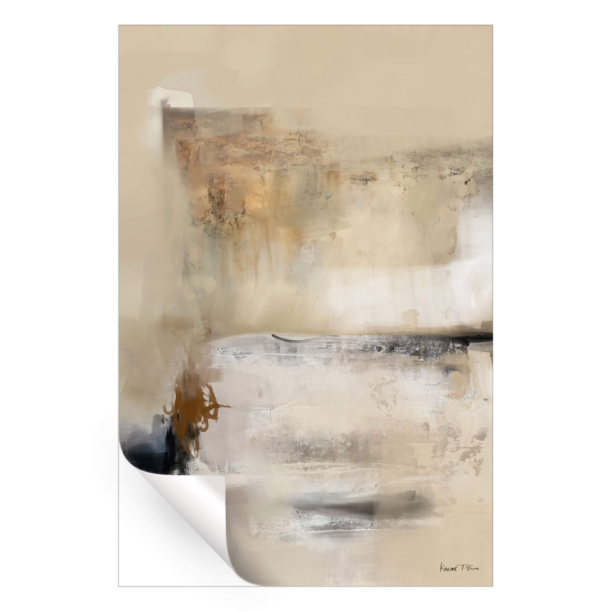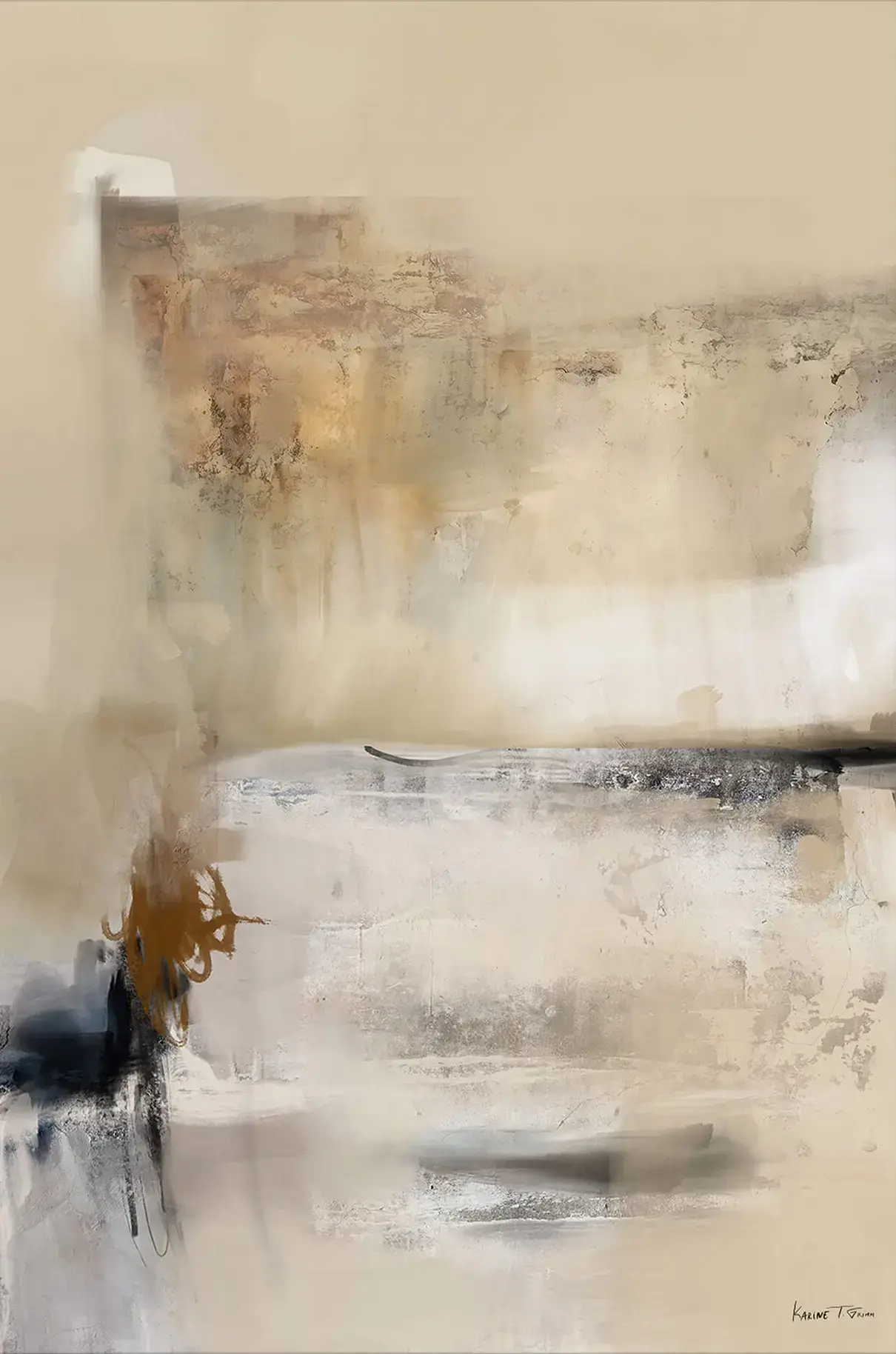 Bold smudges of black and amber disrupt a field of beige and white, creating a sense of tension and drama in this abstract composition. The forms, colors, and texture are reminiscent of an ancient structure. The artwork holds a sense of history and modernity, a visual narrative open to interpretation.