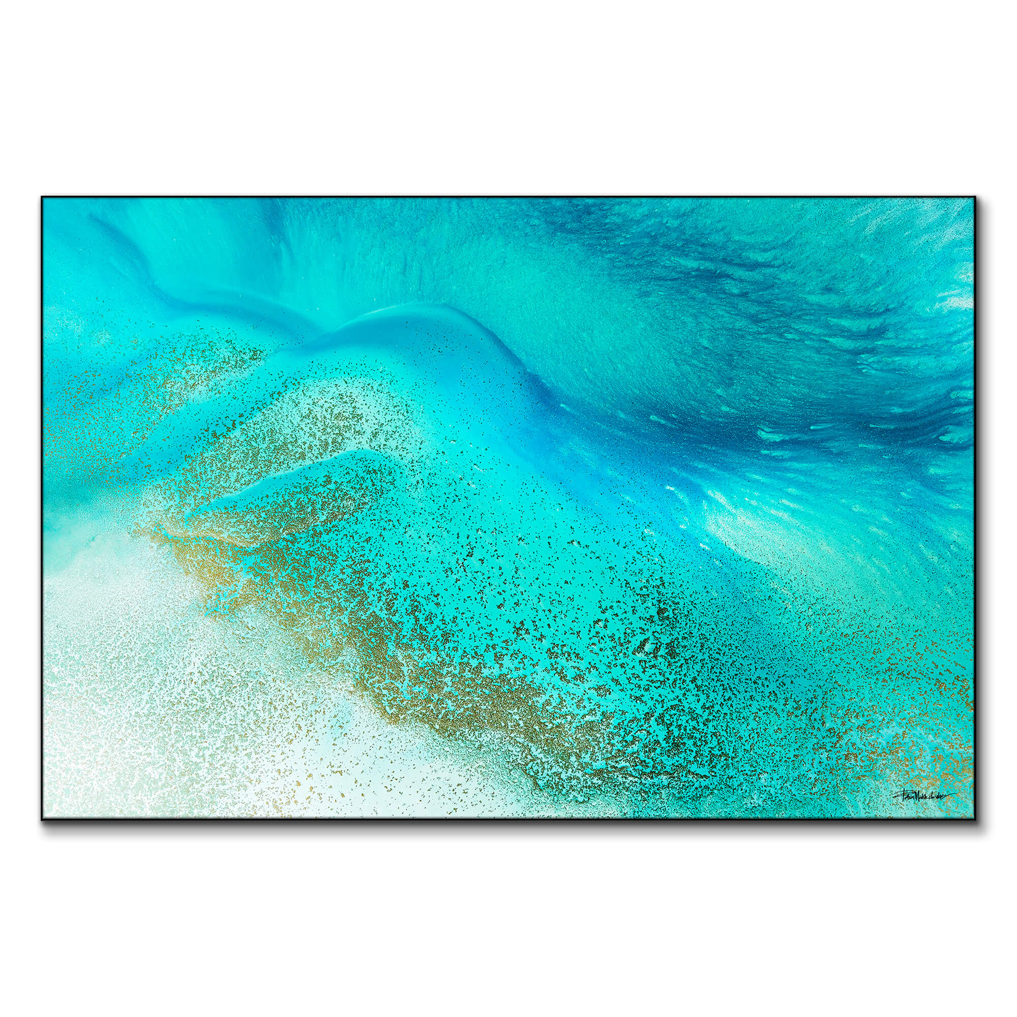 A breathtaking view of turquoise water gently crashing against the shoreline. The vibrant blue hues are accentuated with hints of frothy white, evoking a sense of serenity and tropical calm. This painting captures the beauty of an untouched beach, where the sea blends seamlessly with the sky, offering a peaceful escape to nature’s tranquility.