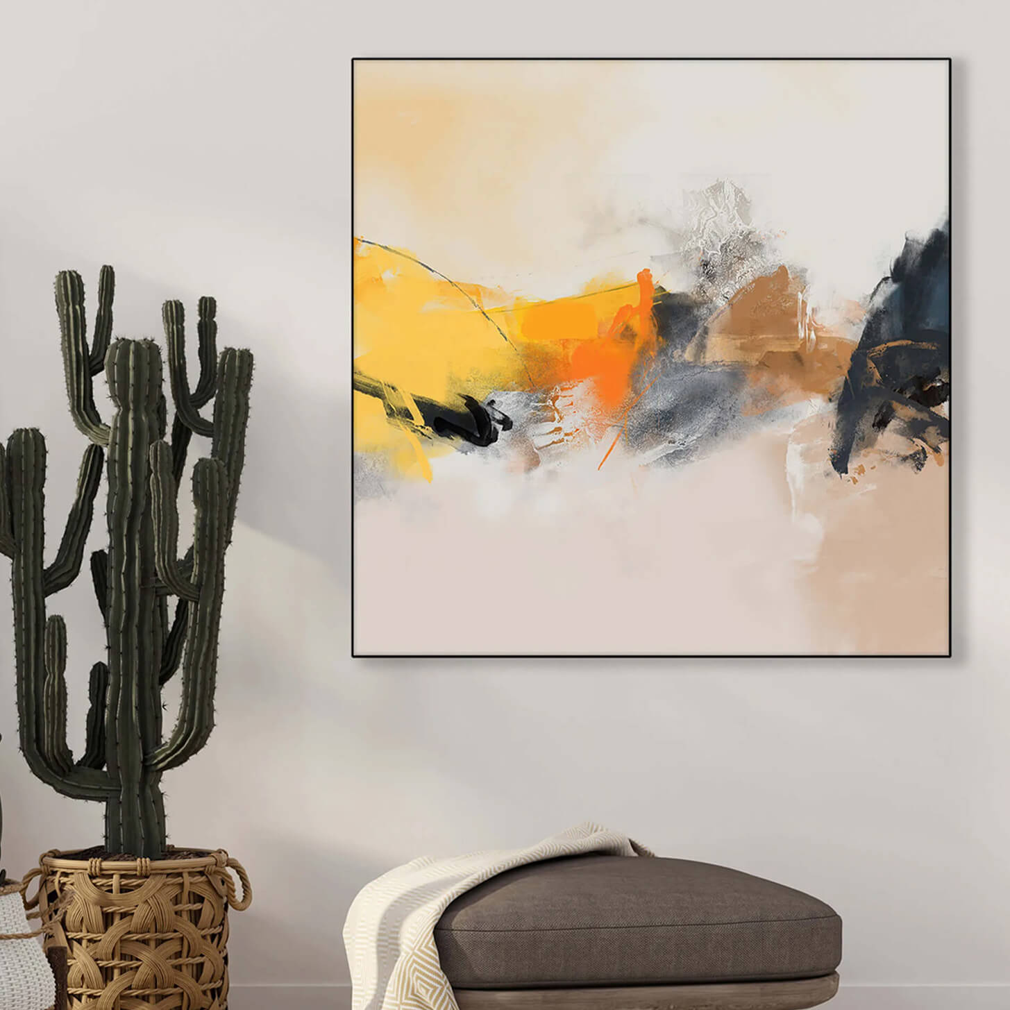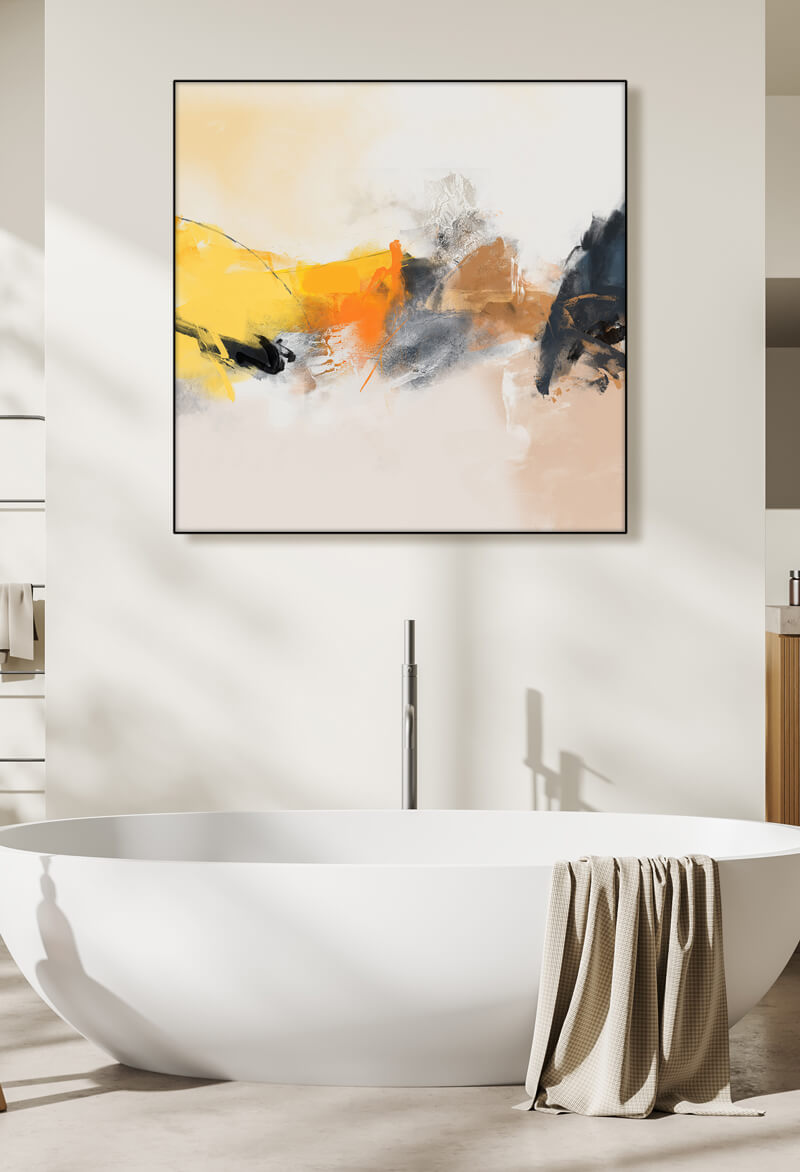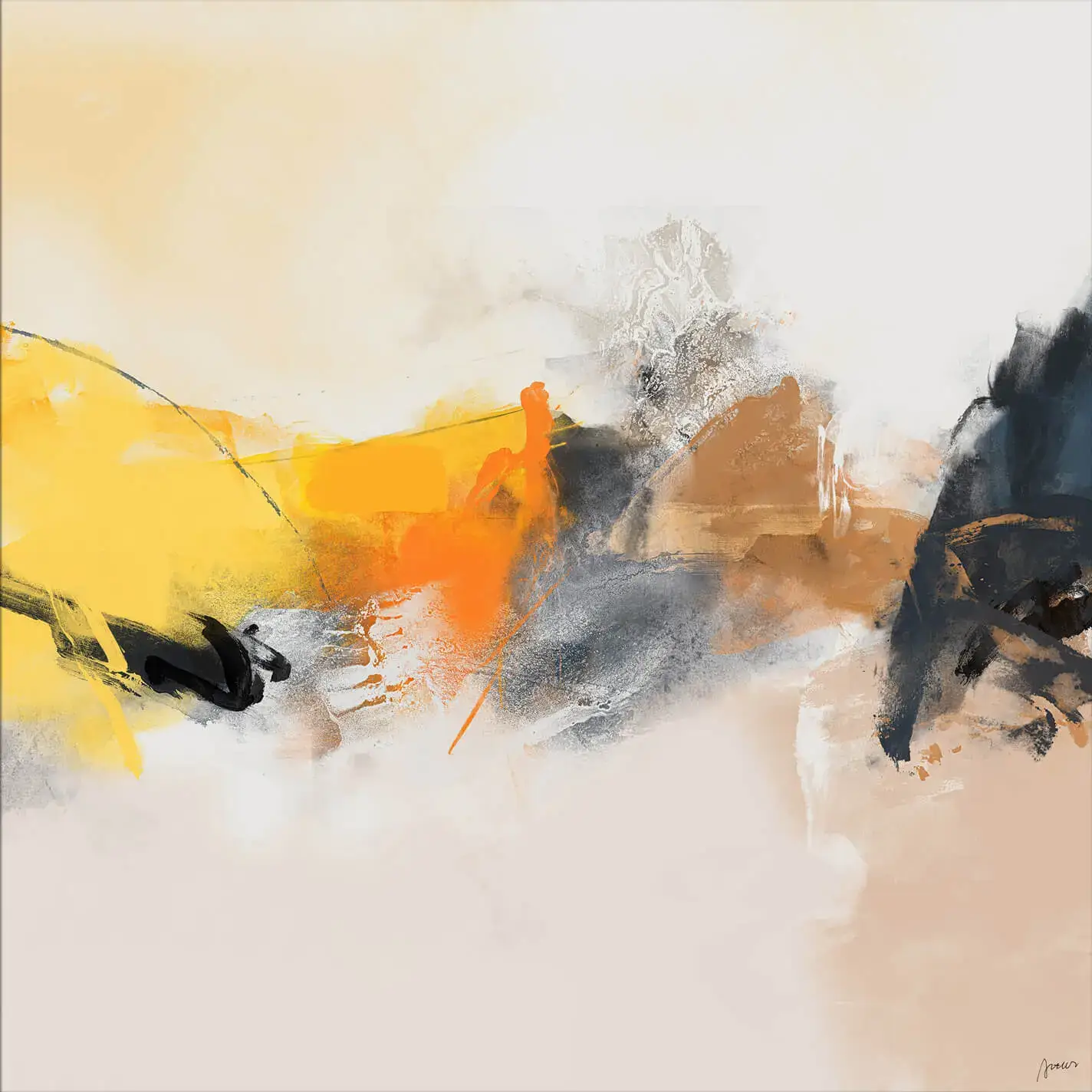 Swathes of warm yellow and orange hues sweep across the scene, tempered by areas of cool grey and black. These elements converge in a soft, sandy background. Textural details add depth, with some areas appearing smoothly blended and others showing rough, almost gritty textures.