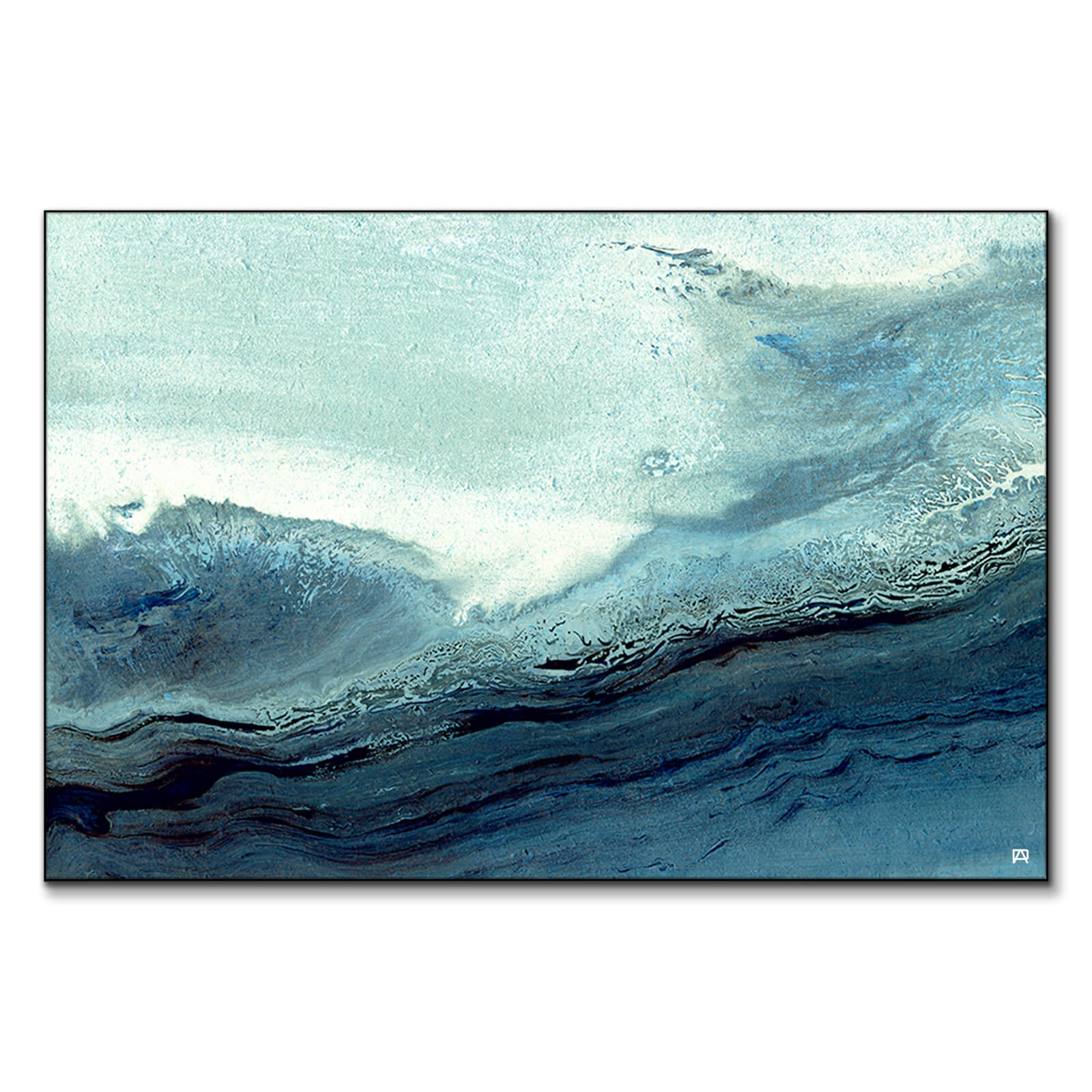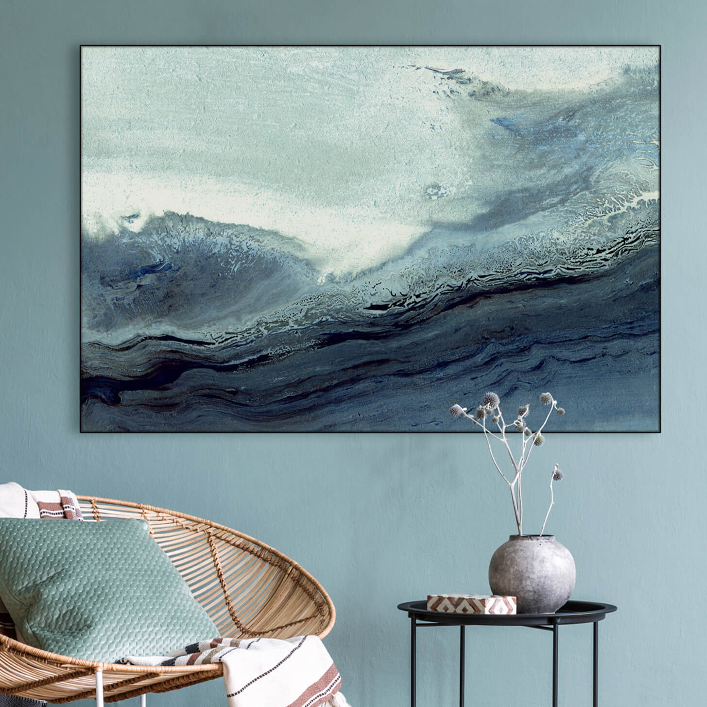 Subtle marbling produces delicate vein-like patterns that echo wet sand left behind by receding water. Occasional sapphire bursts glimmer inside the darker layers, adding depth and movement. The clean edges and lack of figurative elements place the composition firmly within large abstract wall art. Yet the palette and horizontal flow make it equally at home among ocean inspired artwork and coastal beach wall art prints. Hang it wide and low and the room seems to open like a seaside vista.