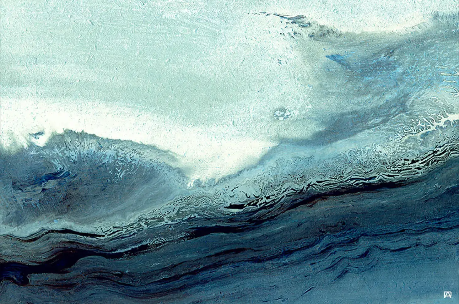 A pale glacial blue sky seems to pour downward into a churning band of indigo. The top third of the horizontal plane is almost serene, a misty field of soft texture that mimics sunlight striking sea spray. Below, layered streaks of navy, teal, and midnight drift like sediment carried by a powerful current. Feathered white lines trace the leading edge of the flow, suggesting foam curling over a cresting breaker. The image feels both frozen and fluid, as if time paused just when the ocean inhaled.