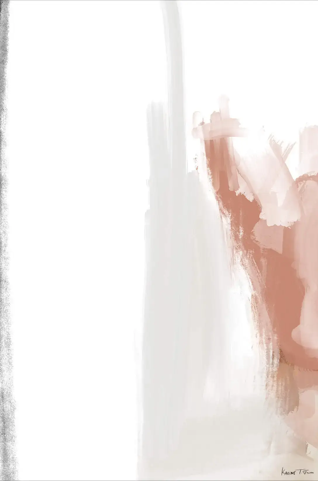 Large strokes of pale, misty white rise vertically, dominating the space with a tranquil presence. A subtle hint of blush tinges the edges, hinting at a warmth that’s almost felt rather than seen. There is a purity and quietness to this minimalist scene, a stillness that speaks of moments untouched by time.