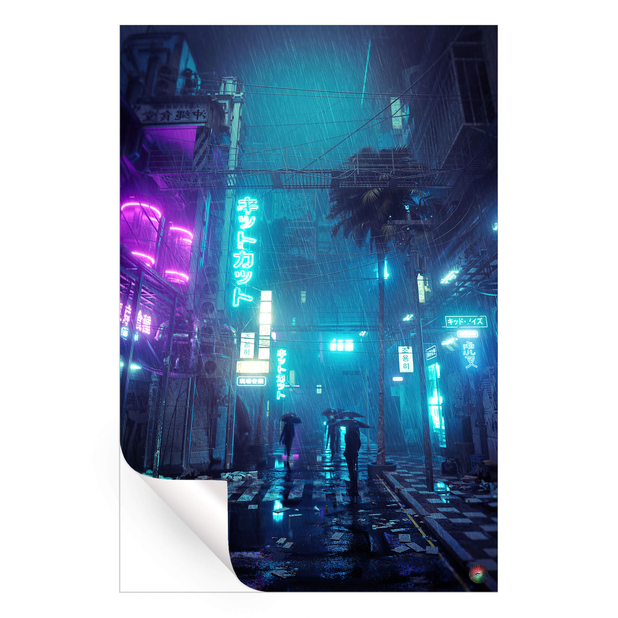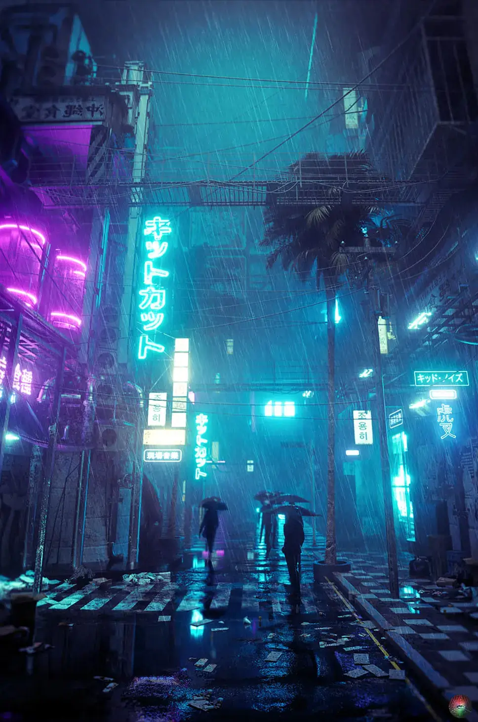 In the quiet of a torrential downpour, figures with umbrellas navigate a street veiled in the glow of neon signs. Rain casts everything in a shimmering sheen, reflecting the myriad of lights and the shadowy outlines of palm trees against the facades of urban structures.