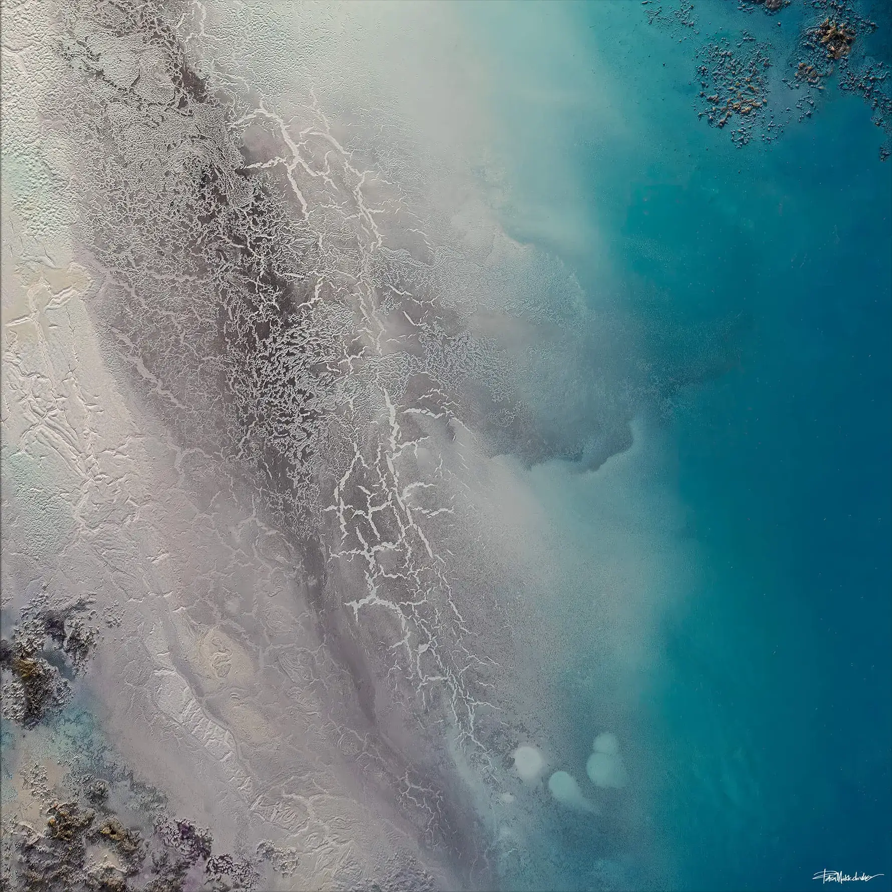 Soft sandy tones blend into pale aqua, then shift into deep ocean blue, creating a calm, washed-coast feel. Smooth shapes and gentle swirls look like sandbars and tidal channels seen from above, almost like you are catching that quiet moment when the tide pulls back and leaves delicate patterns behind. Light beige fades into clear water hues, and darker blues settle at the edges, giving the piece depth without feeling heavy. Little textured pockets hint at reef clusters or underwater rock formations, adding just enough detail to make you linger.