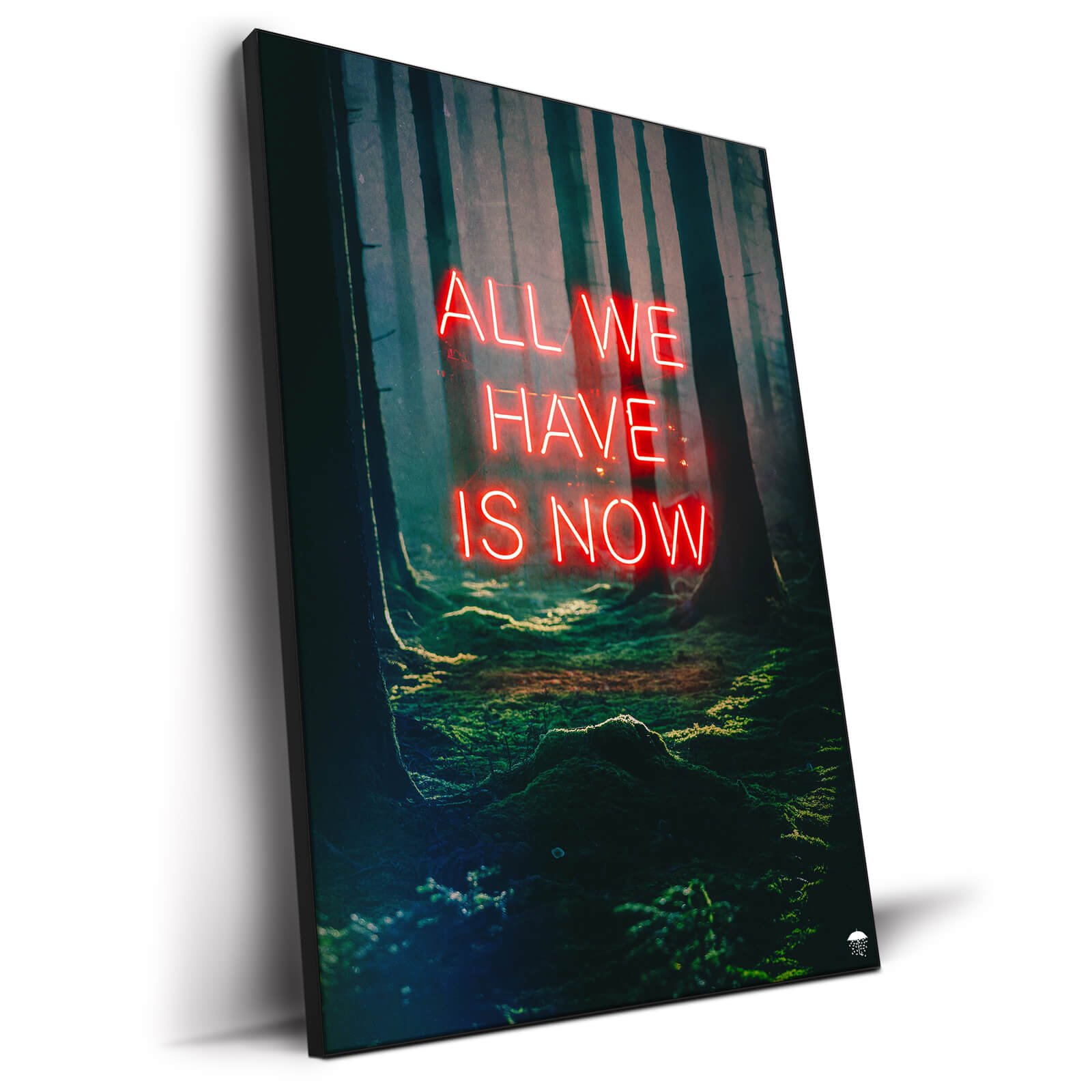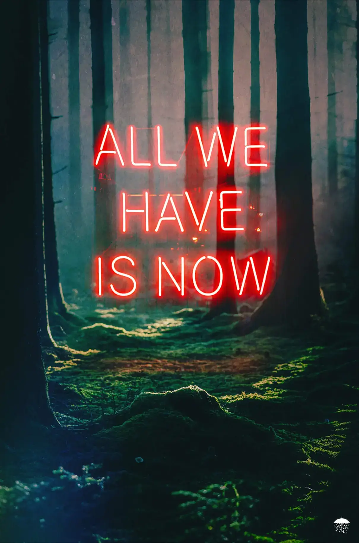 The forest floor, carpeted with moss and undergrowth, is faintly illuminated by the neon light, which cuts through the darkness and fog with its message. The scene is both haunting and calm, a fusion of nature’s beauty and the immediacy of human contemplation.