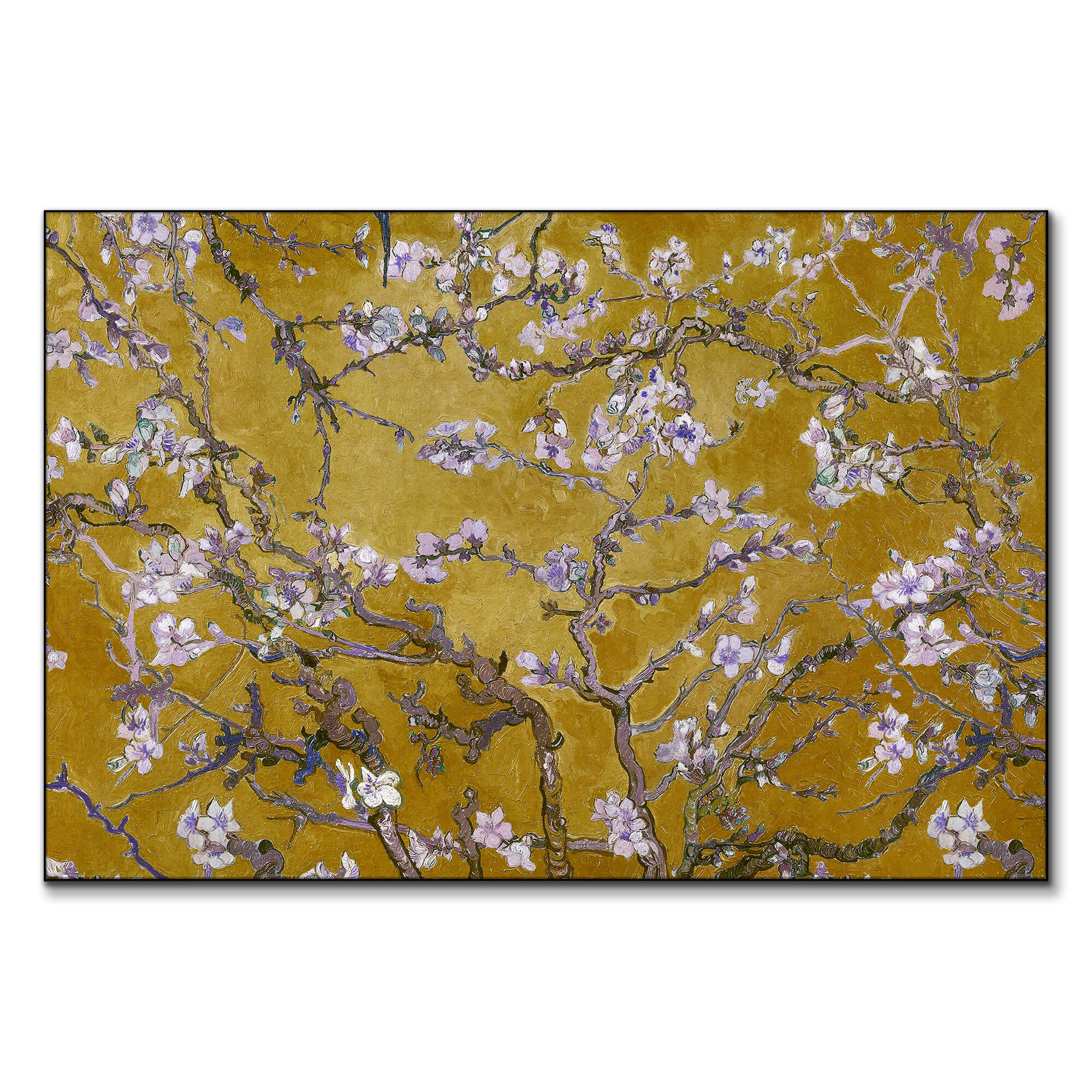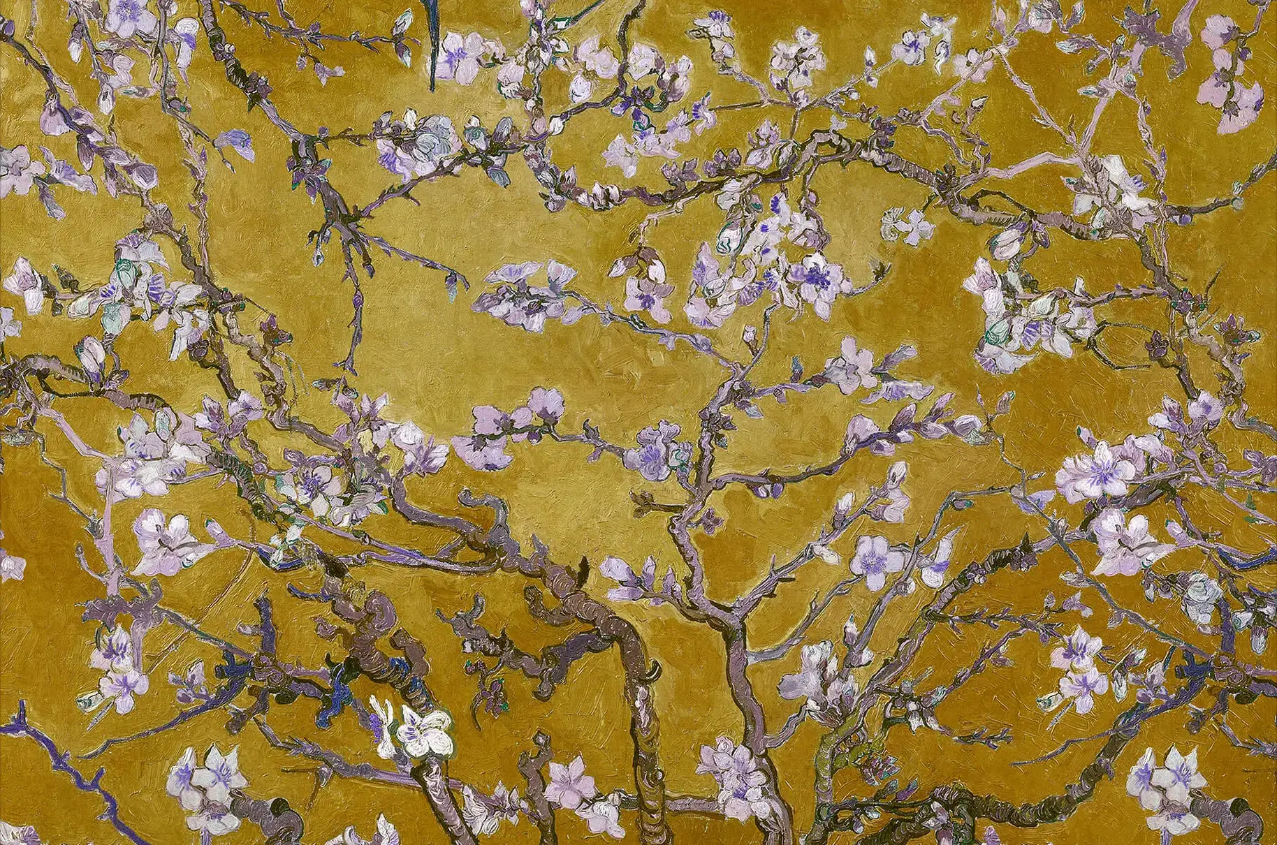 In Almond Blossom by Vincent van Gogh, twisting almond branches stretch across a burnished gold background, each limb tipped with pale lavender petals and soft sage buds. Fine indigo outlines trace the wood grain, while subtle impasto textures shimmer under the neutral-gold palette. Tiny highlights in white and blush suggest morning sunlight catching freshly opened flowers. Negative space is minimal, so the composition feels lush yet orderly. The horizontal layout guides the viewer’s gaze from left to right as if following a gentle spring breeze. Close inspection reveals brush marks that mimic oil on canvas, yet the high-definition print keeps every detail crisp. Hints of mossy green bring life to the bark, balancing the warm metallic field. Overall the painting radiates calm, romance, and quiet optimism.