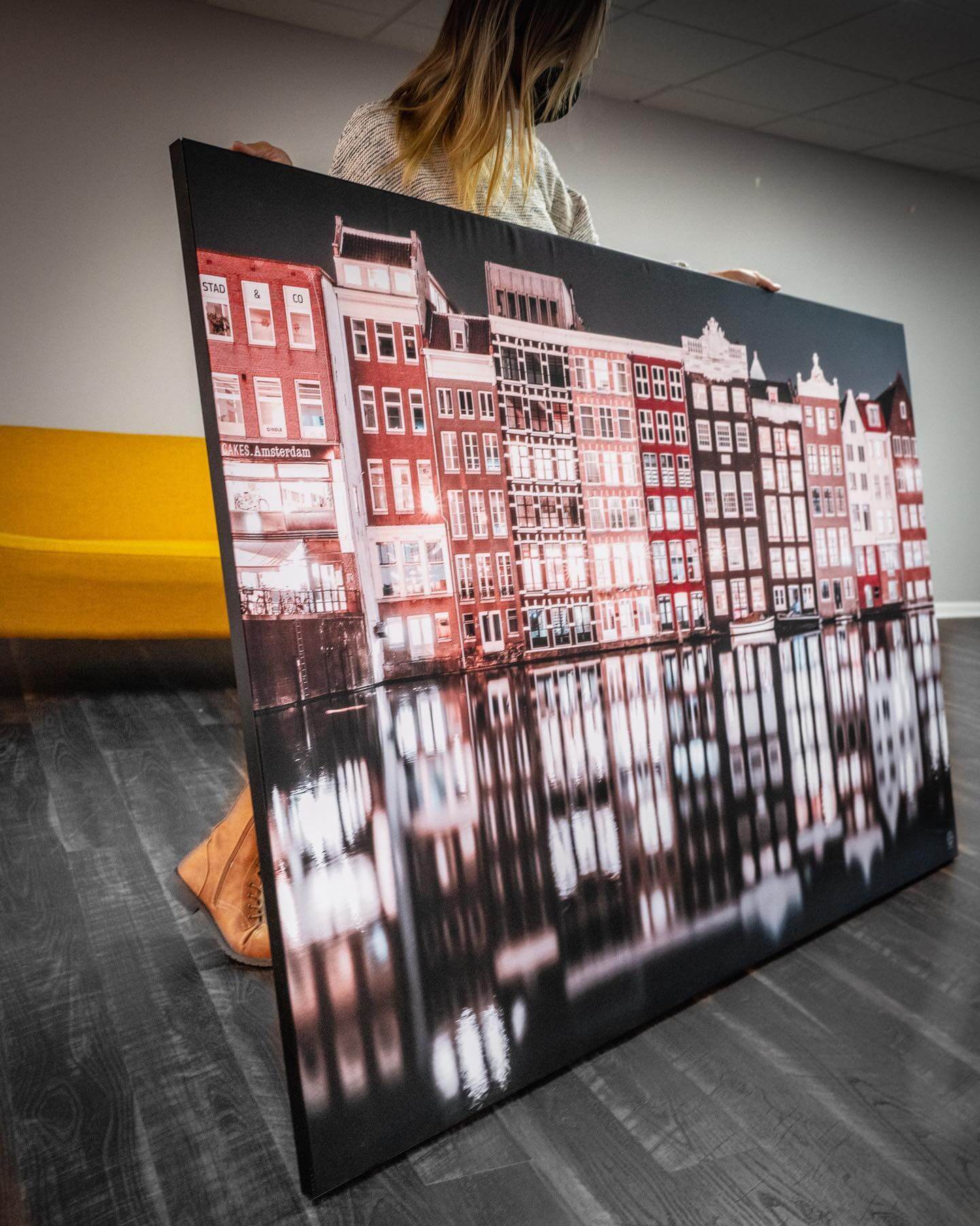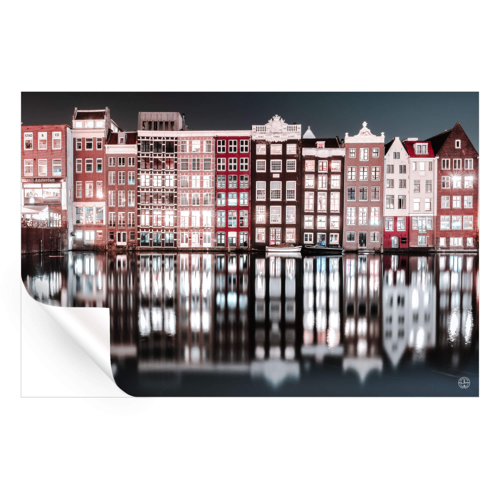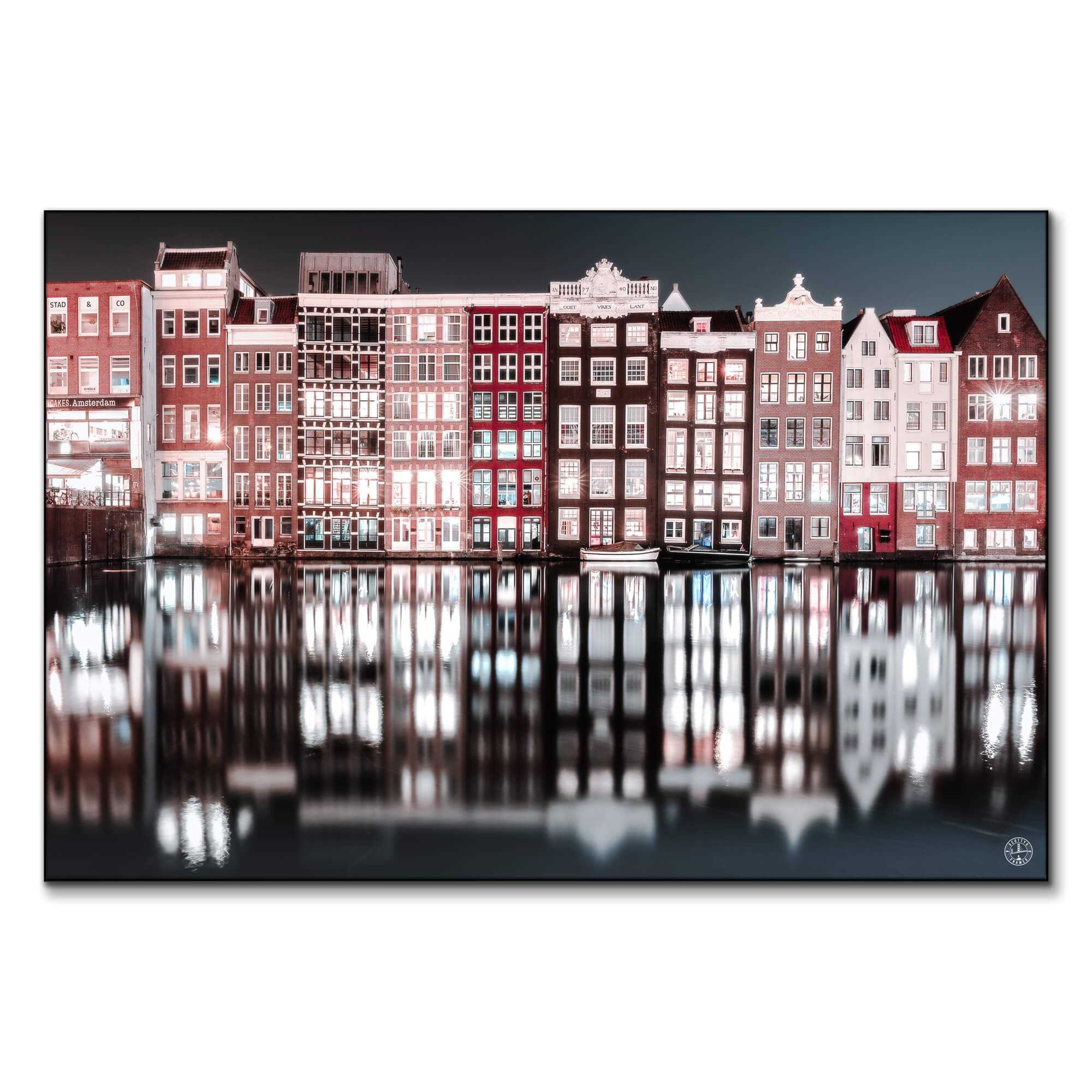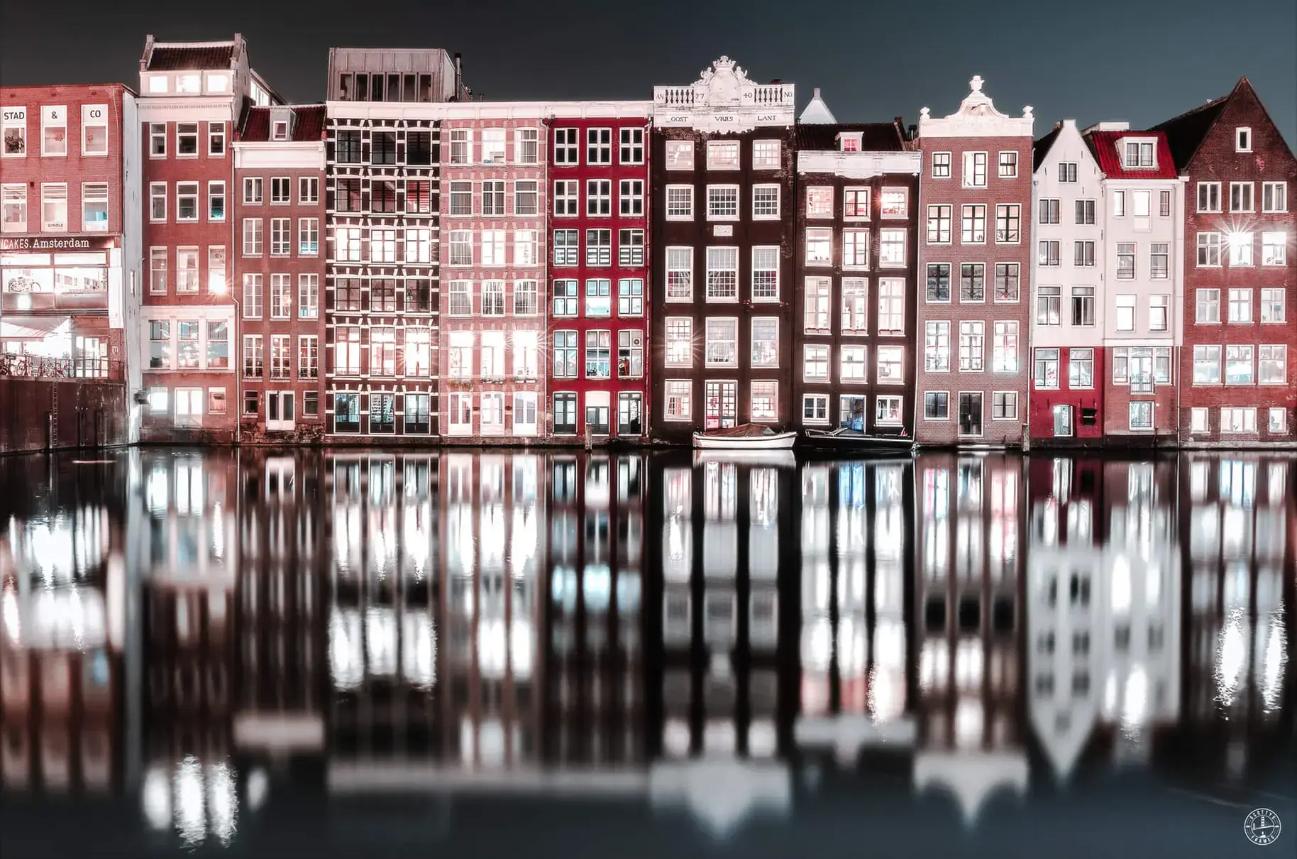 The calm waters of Amsterdam’s canals serve as a canvas, reflecting the city’s historic houses in vibrant detail. In this piece by Scott Wilson, the stoic facades and their mirrored images merge, creating a surreal yet harmonious scene.