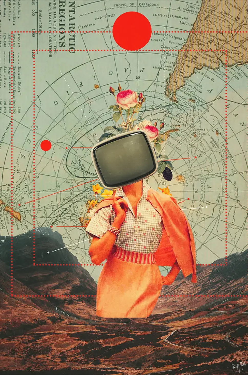 A figure stands before a map of navigational lines and topographical contours, their head replaced by a vintage television set. Blooms and leaves sprout from the top of the TV, suggesting a fusion of technology and organic growth. The figure’s attire is reminiscent of mid-century fashion, and they seem to be on a journey, guided by the map behind them.